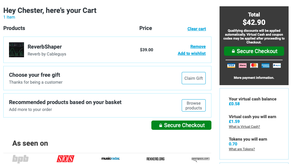 홈페이지 상단 우측에 자리 잡은 Cart를 누르면 다음과 같은 화면이 나타난다. 이 화면에서는 이번 구매로 적립되는 캐시, 구매로 적립되는 토큰을 확인할 수 있으며 상품 구매로 받을 수 있는 무료 선물을 선택할 수 있다. 만일 Plugin Boutique에서 처음 구매한다면 상단의 이미지처럼 Claim Gift를 클릭해서 무료 선물을 받아가는 게 좋다. 플러그인 하나만 샀을 뿐인데 공짜로 다른 플러그인들도 가져갈 수 있다. 무료로 받을 수 있는 플러그인들은 기간에 따라 다르니 미리 구매 전에 어떤 걸 무료로 주는지 체크해 보는 것도 좋다. 모든 작업이 완료되었다면 초록색 "Secure Checkout"을 눌러 다음 화면으로 넘어가자.