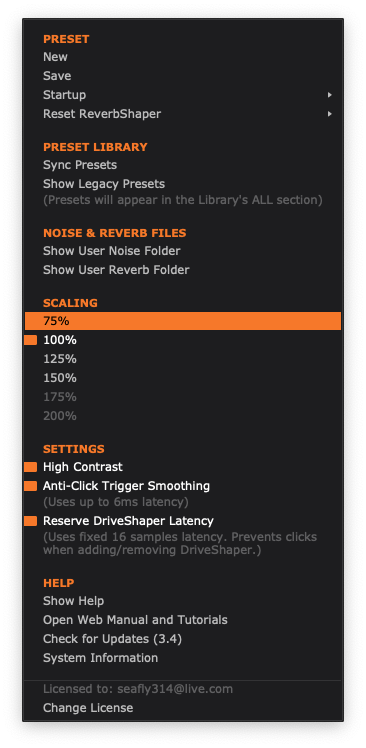 설정 메뉴는 ShaperBox3을 따라간다. 화면 비율 설정 및 라이센스 관리, 매뉴얼 확인 등 메뉴의 정석이다. 프리셋도 이곳에서 만들 수 있다. 프리셋을 제작한다면 자주 방문할 메뉴다. 나도 모르게 까먹을 수 있는 플러그인 업데이트도 메뉴에서 확인할 수 있다.