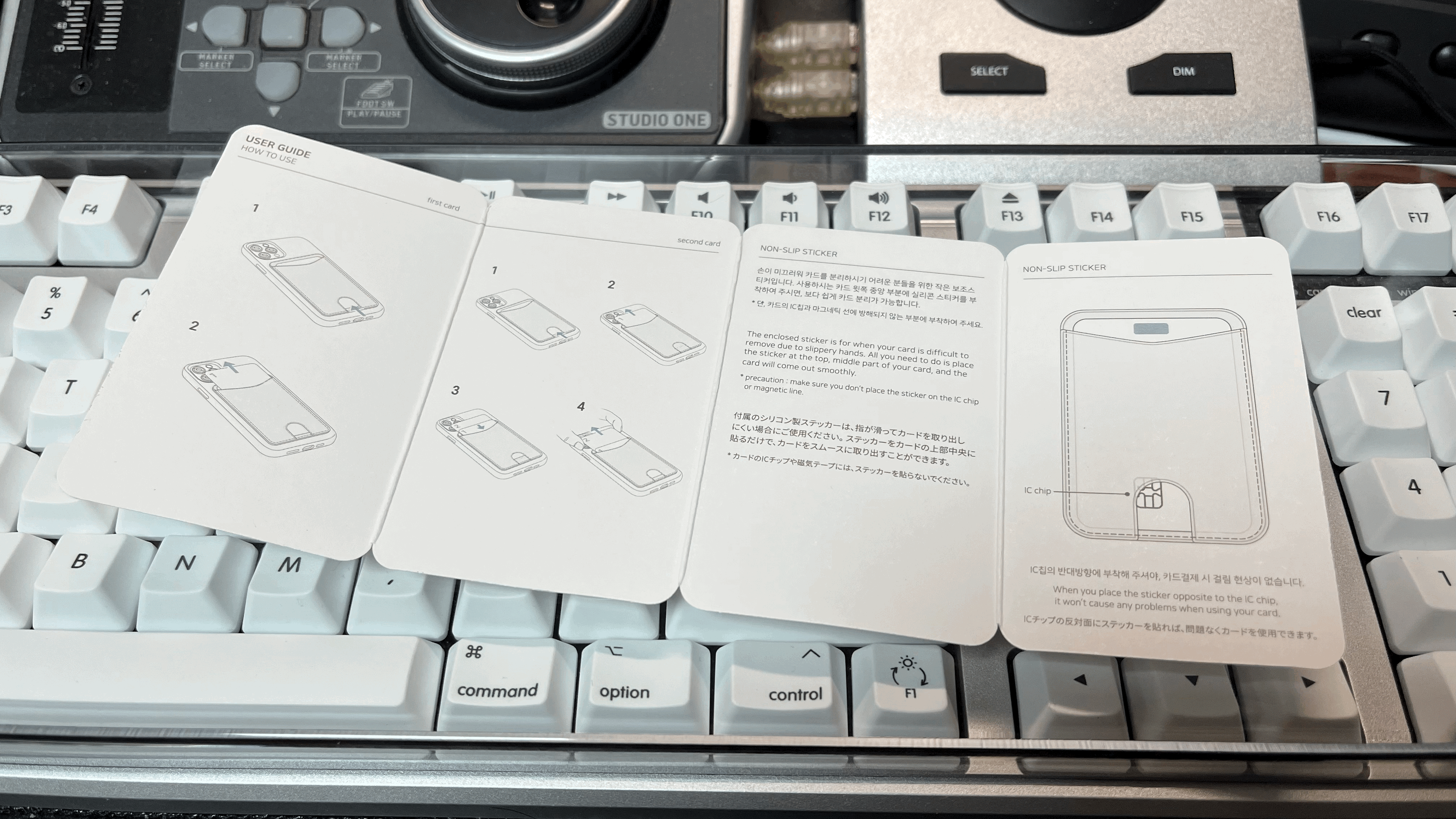 설명서를 꺼내보았다. 번들로 들어있던 미끄럼 방지 스티커나 카드 꺼내는 법, 가죽 관리하는 법에 대한 간단한 설명이 인쇄되어 있다. 가죽 제품을 처음 쓰는 분에게도 유용하니 한 번쯤 읽어보는 걸 추천한다.