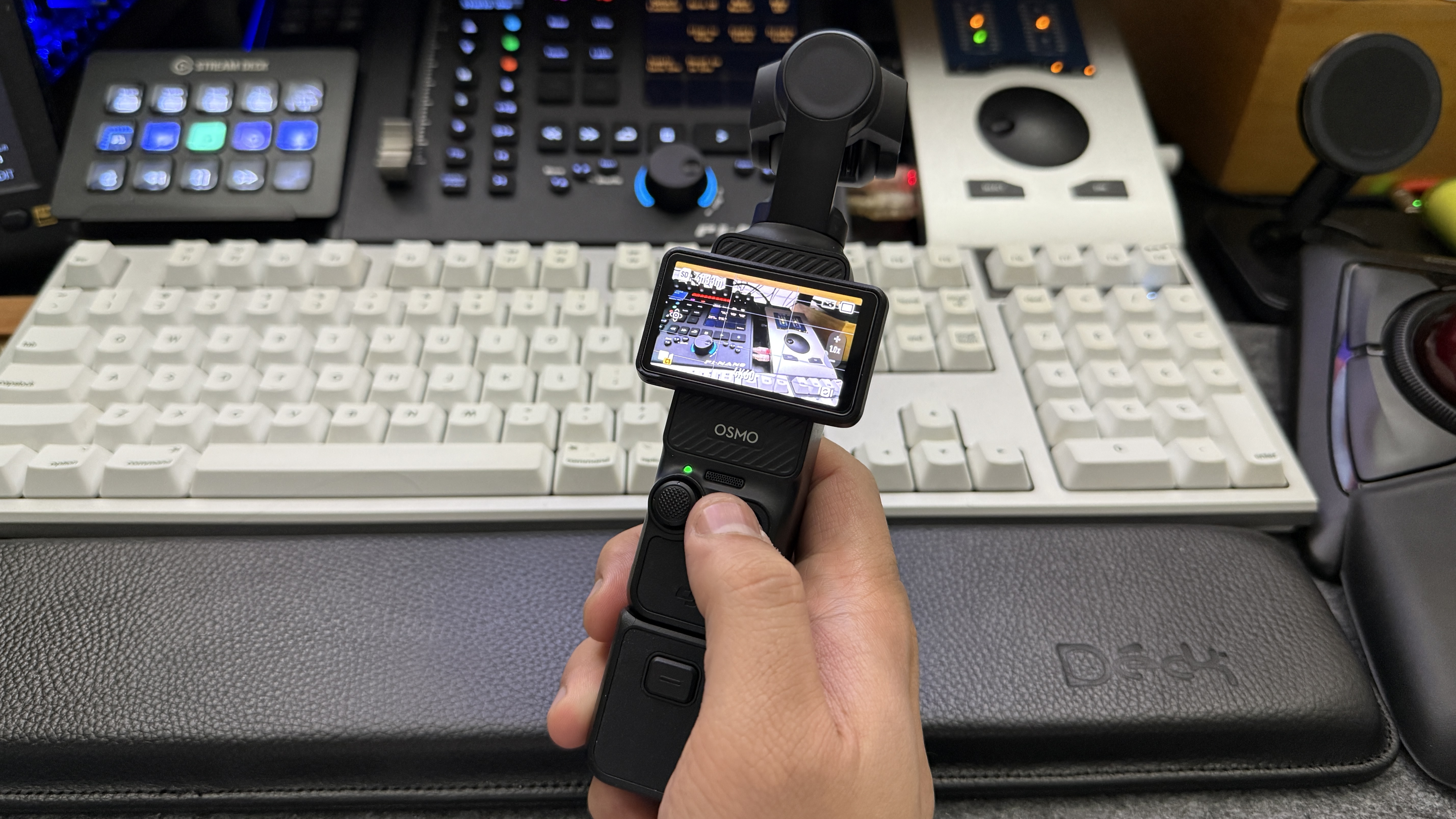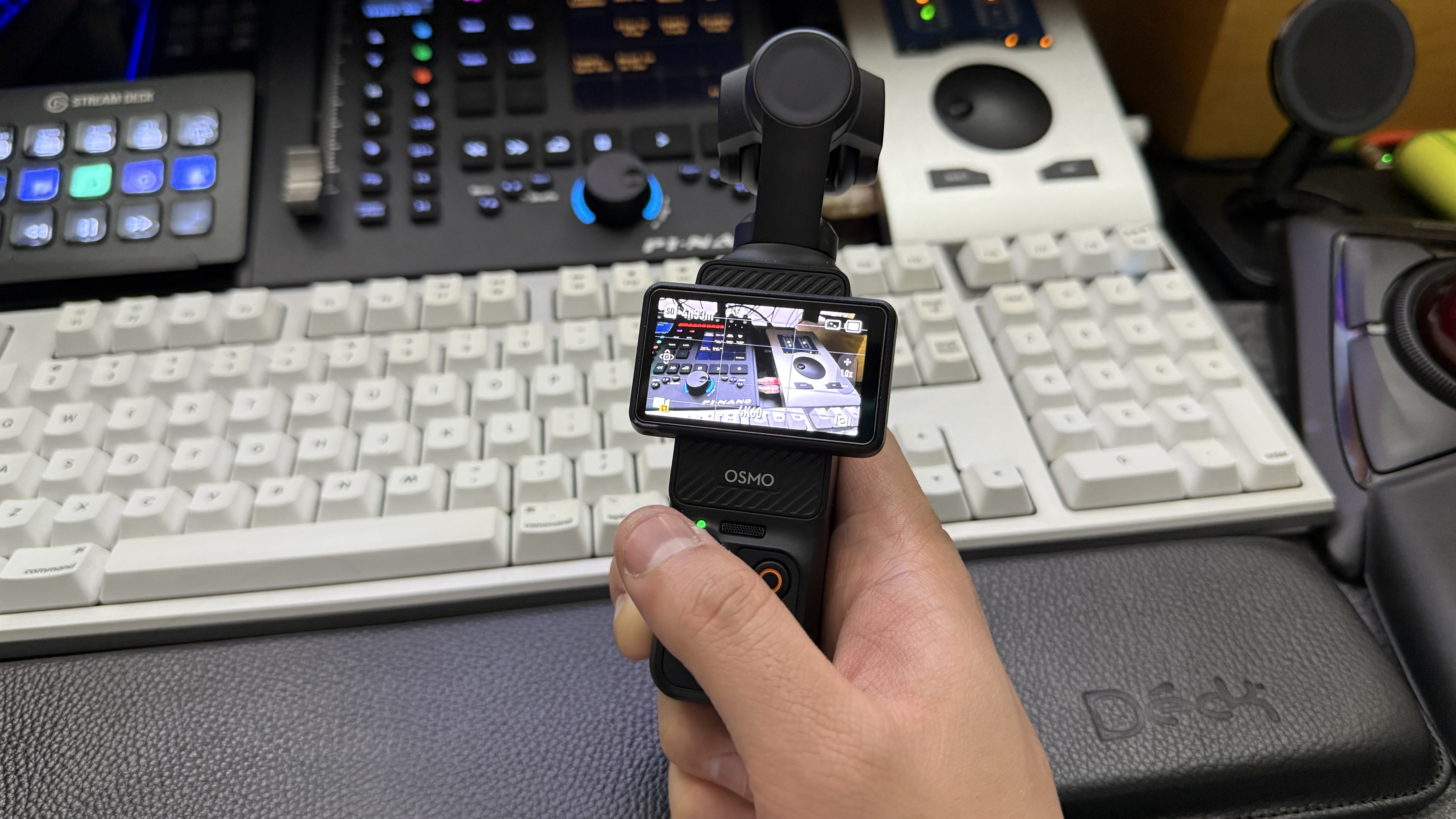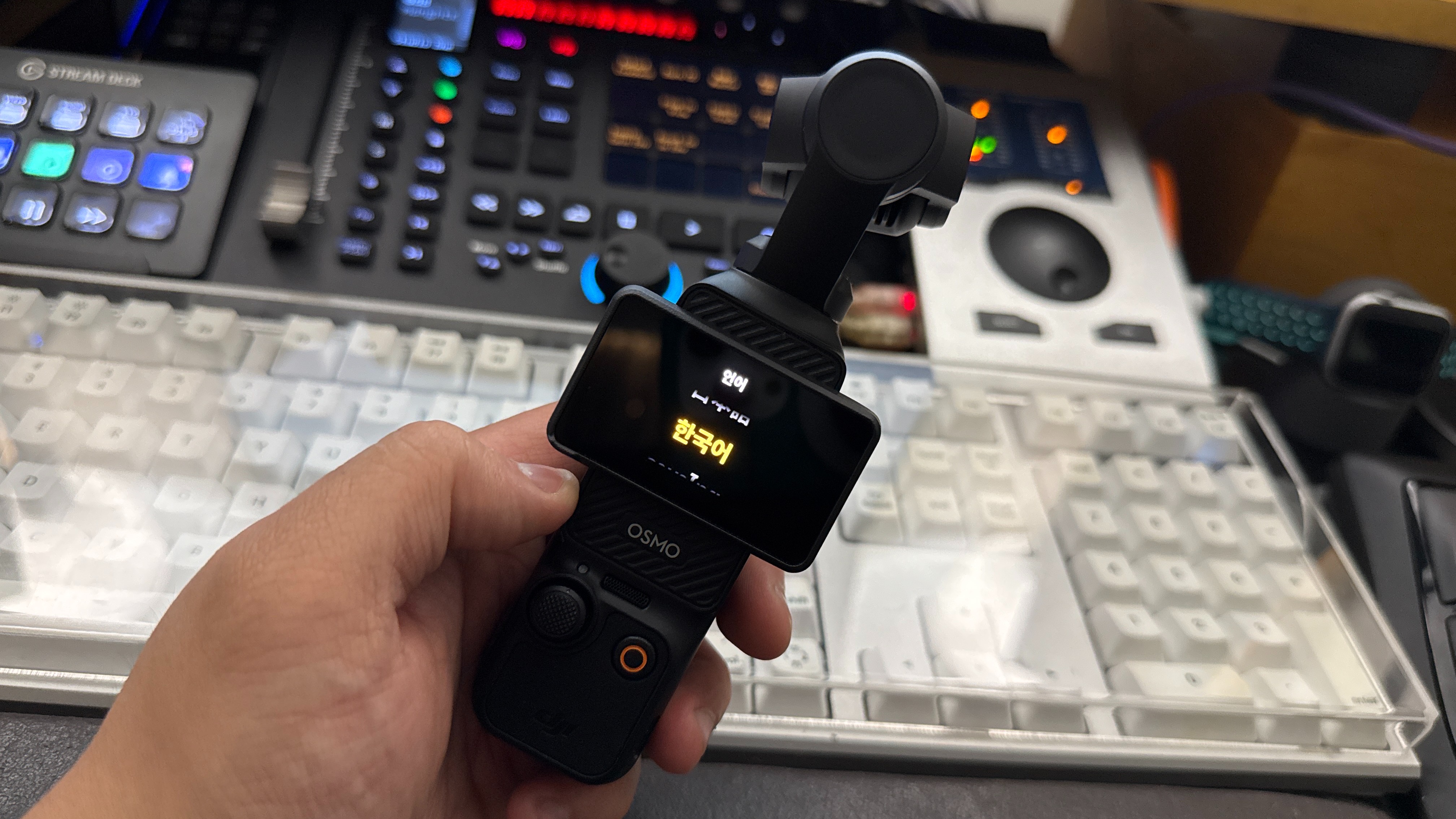 얼추 세팅을 다 마무리한 후 손에 Osmo Pocket 3을 잡아보았다. 굉장히 컴팩트한 크기를 자랑하고 있는 Osmo Pocket이기에 손으로 잡을 때 편한 느낌은 들진 않았다. 크기가 작은 만큼 어느 정도 희생을 했다는 느낌이다.