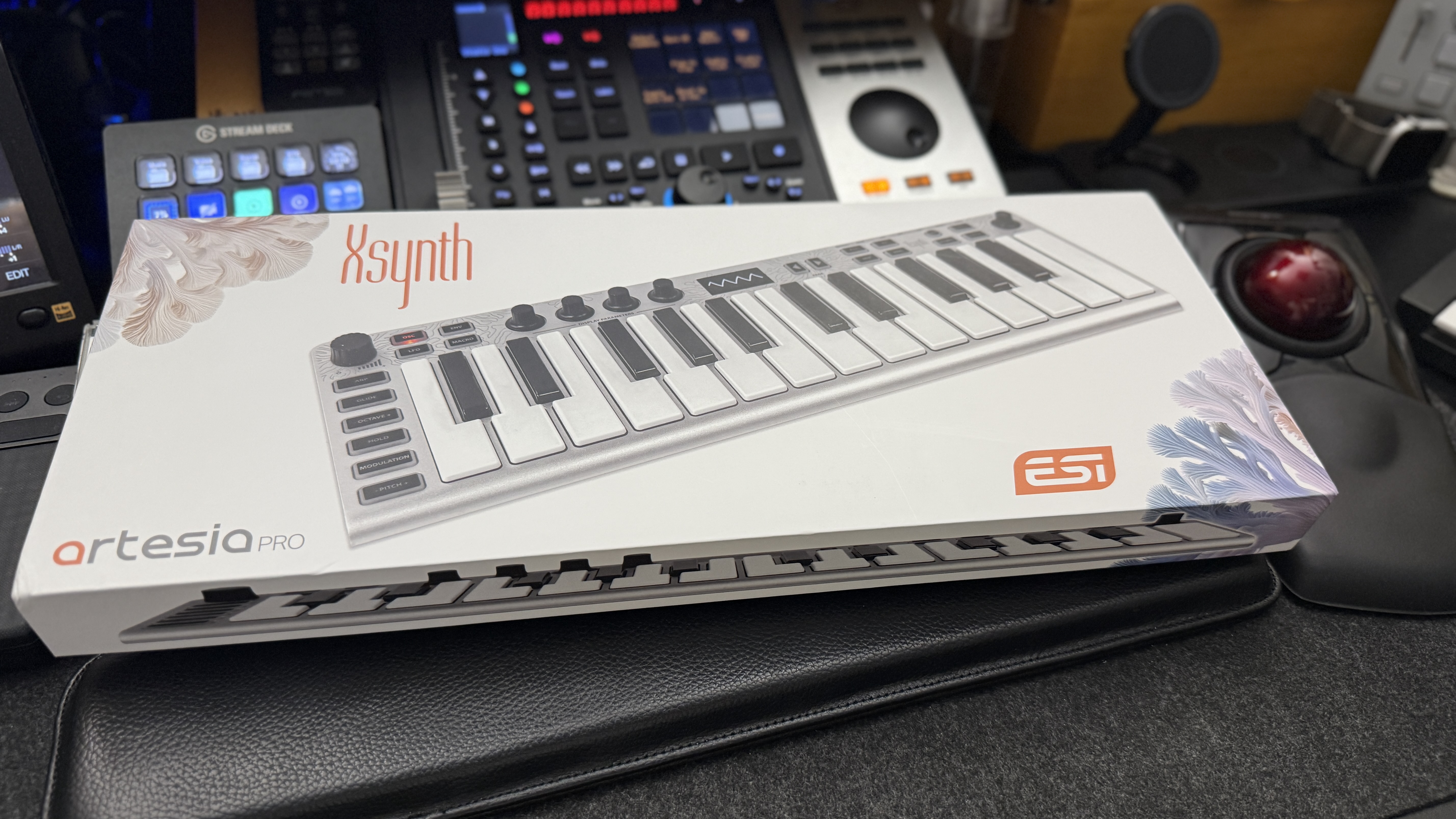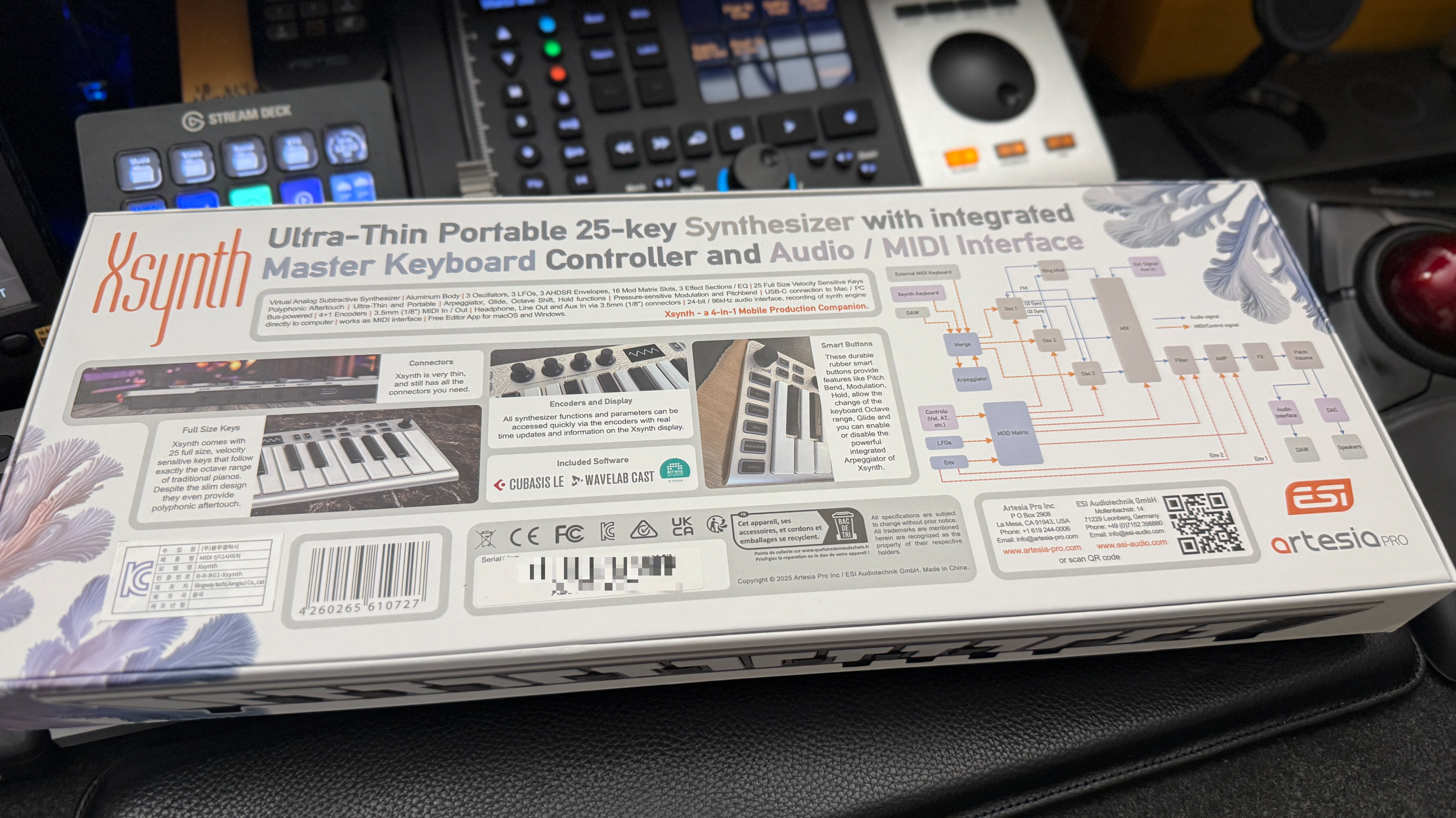 체험단 당첨 직후 하루도 되지 않아 필자의 작업실로 ESI Xsynth가 도착했다. 복고적인 패키지 디자인이 먼저 눈에 들어오는데, 개발에 참여한 Artesia Pro 및 ESI 로고, 그리고 Xsynth의 로고가 먼저 눈에 들어온다. 옛날 CME 시절의 마법사가 그려진 디자인은 아닌데 현대에 맞게 적당히 타협한 디자인이라 생각한다.