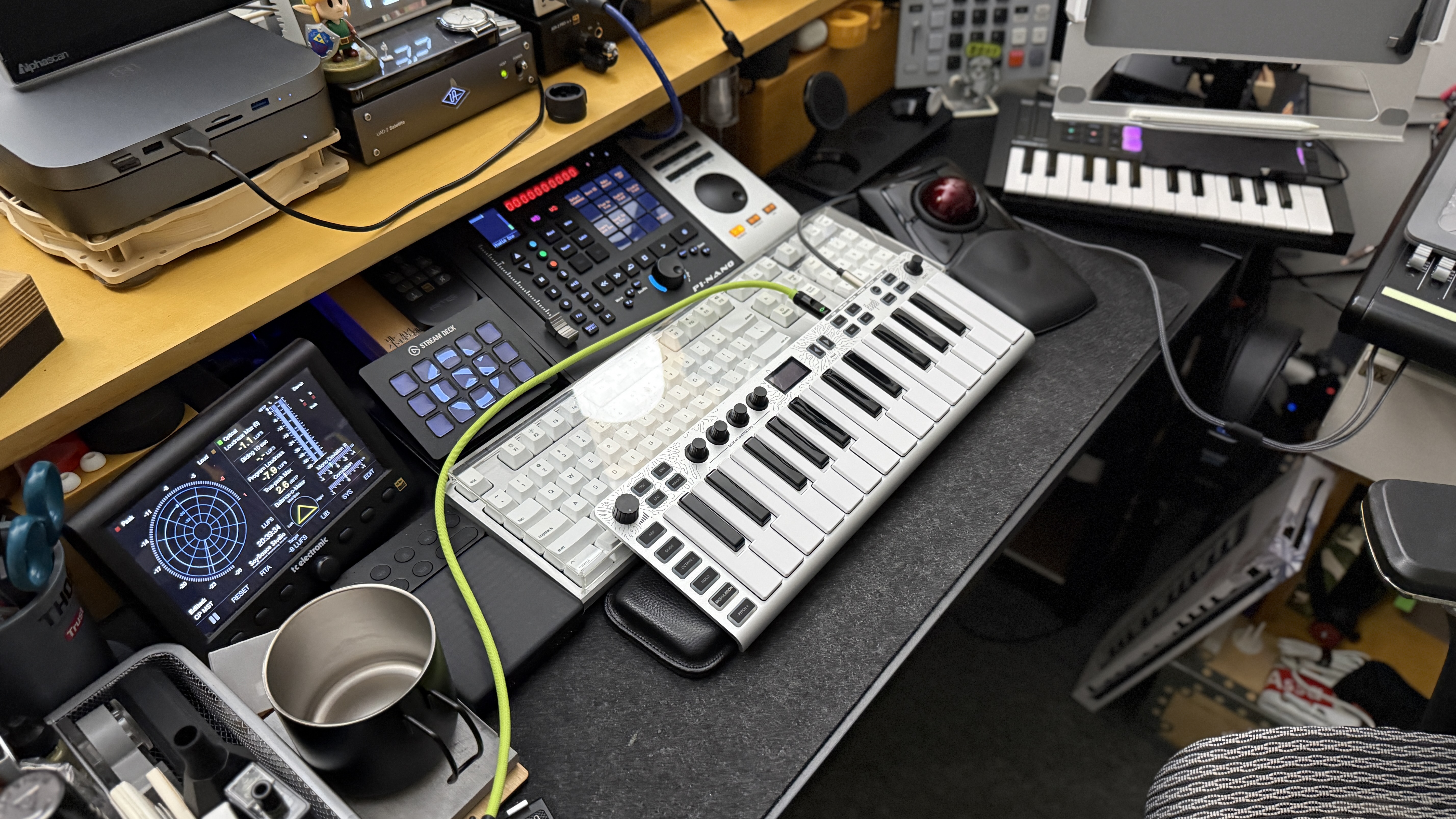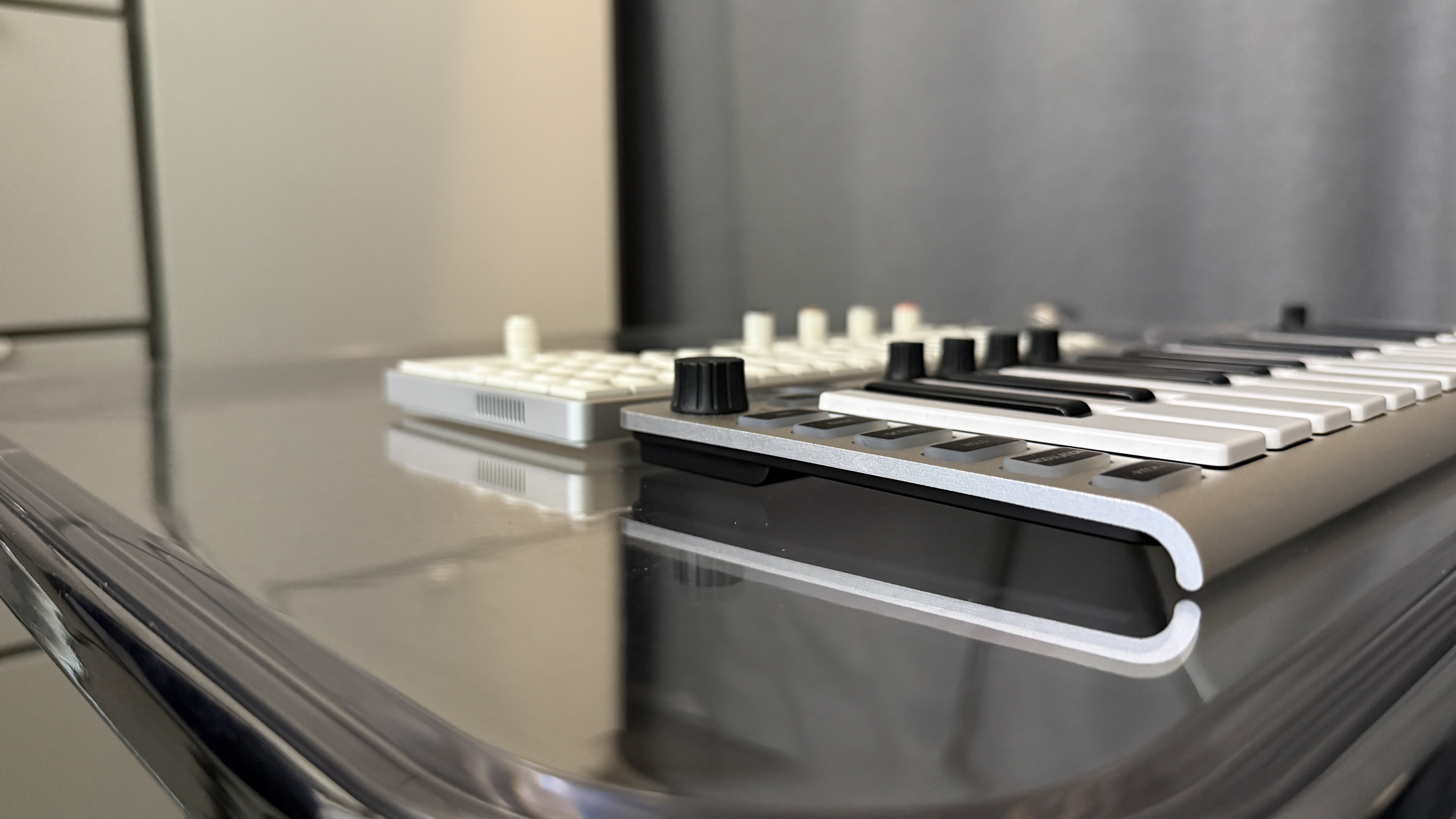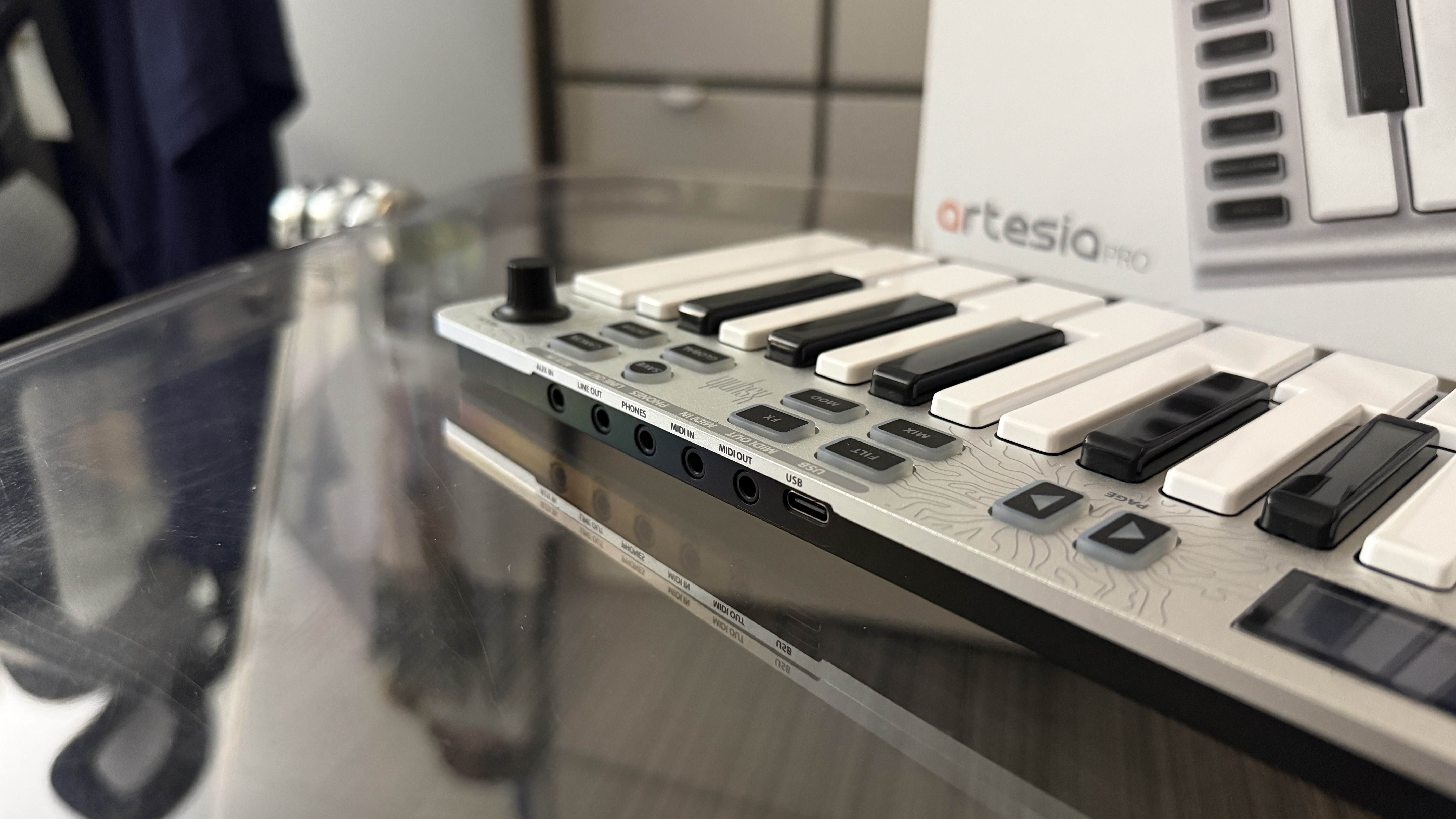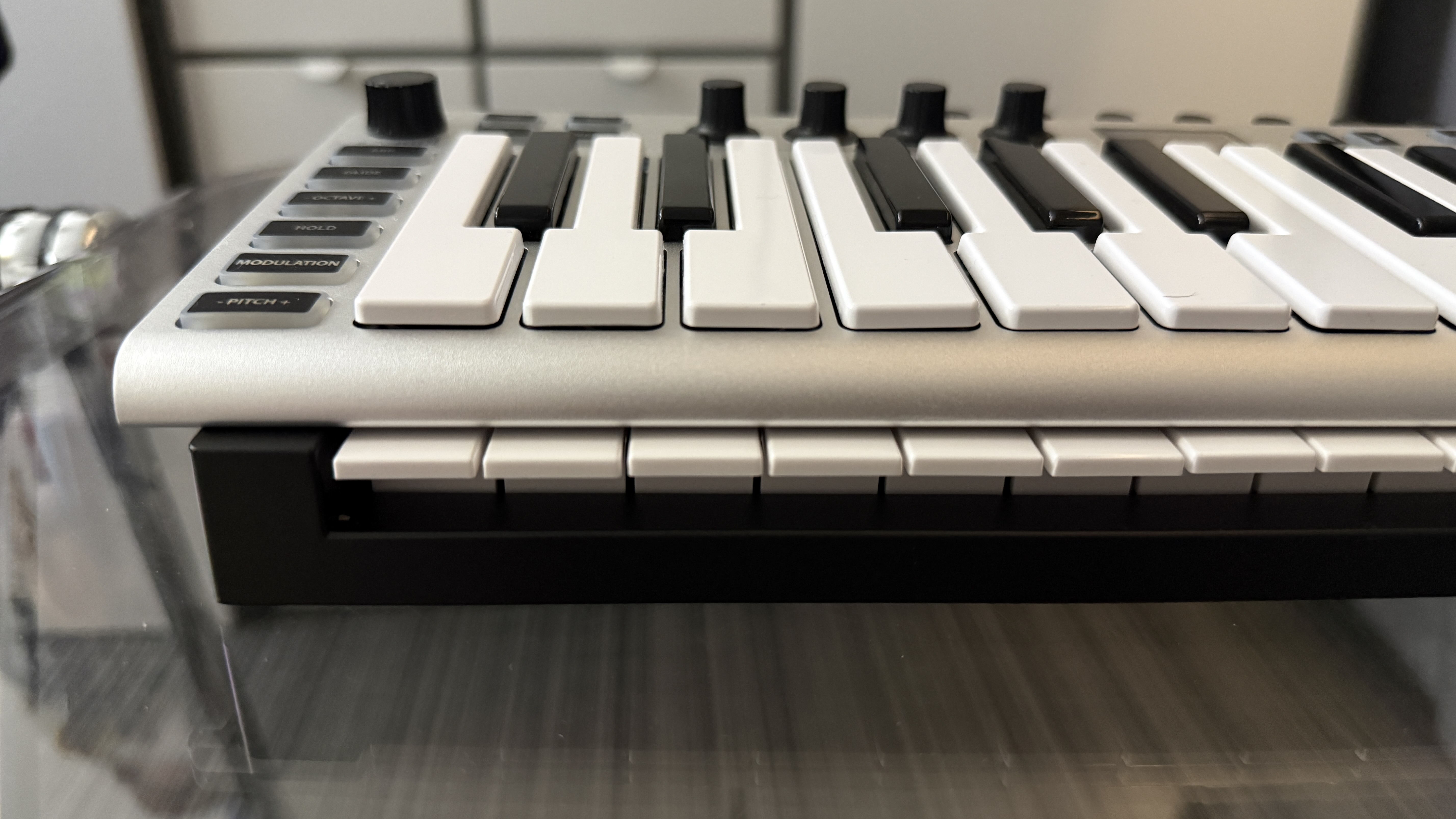 두 번째로는 필자의 주력 마스터 키보드, Novation Launchkey 25 mk4와 비교해 보았다. 이거는 Launchkey 25 키가 상대적으로 작게 느껴졌다. 같은 25 키인데 드럼 패드도 있고 물리적인 피치 터치 및 모듈레이션 터치 스트립이 있음에도 불구하고 Launchkey 25 키가 작게 느껴지는지 신기할 뿐이다. 물론 상하로 조금 더 넓긴 하지만 새삼 대기업 Novation의 기술력이 감탄스러울 뿐이다.