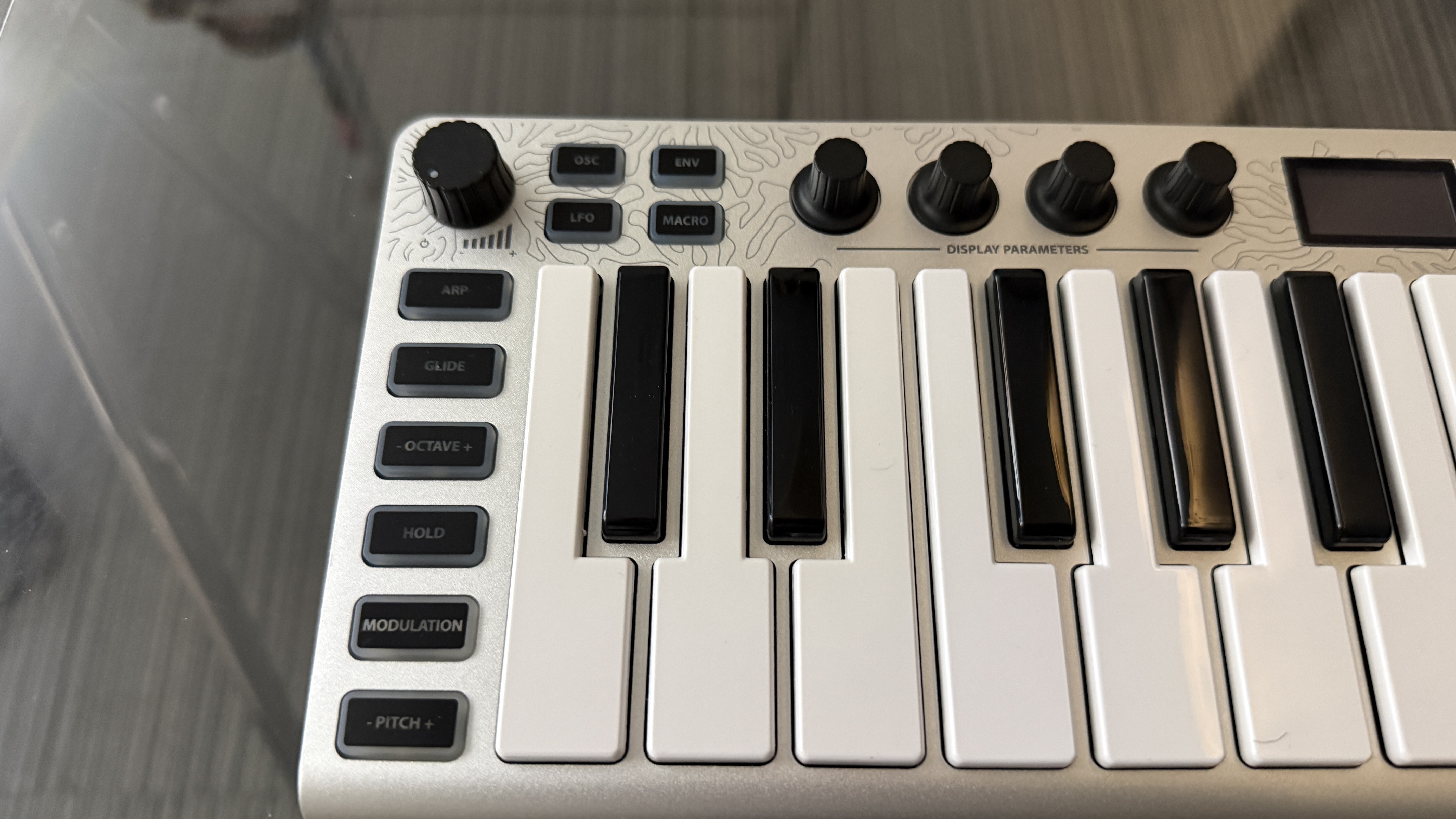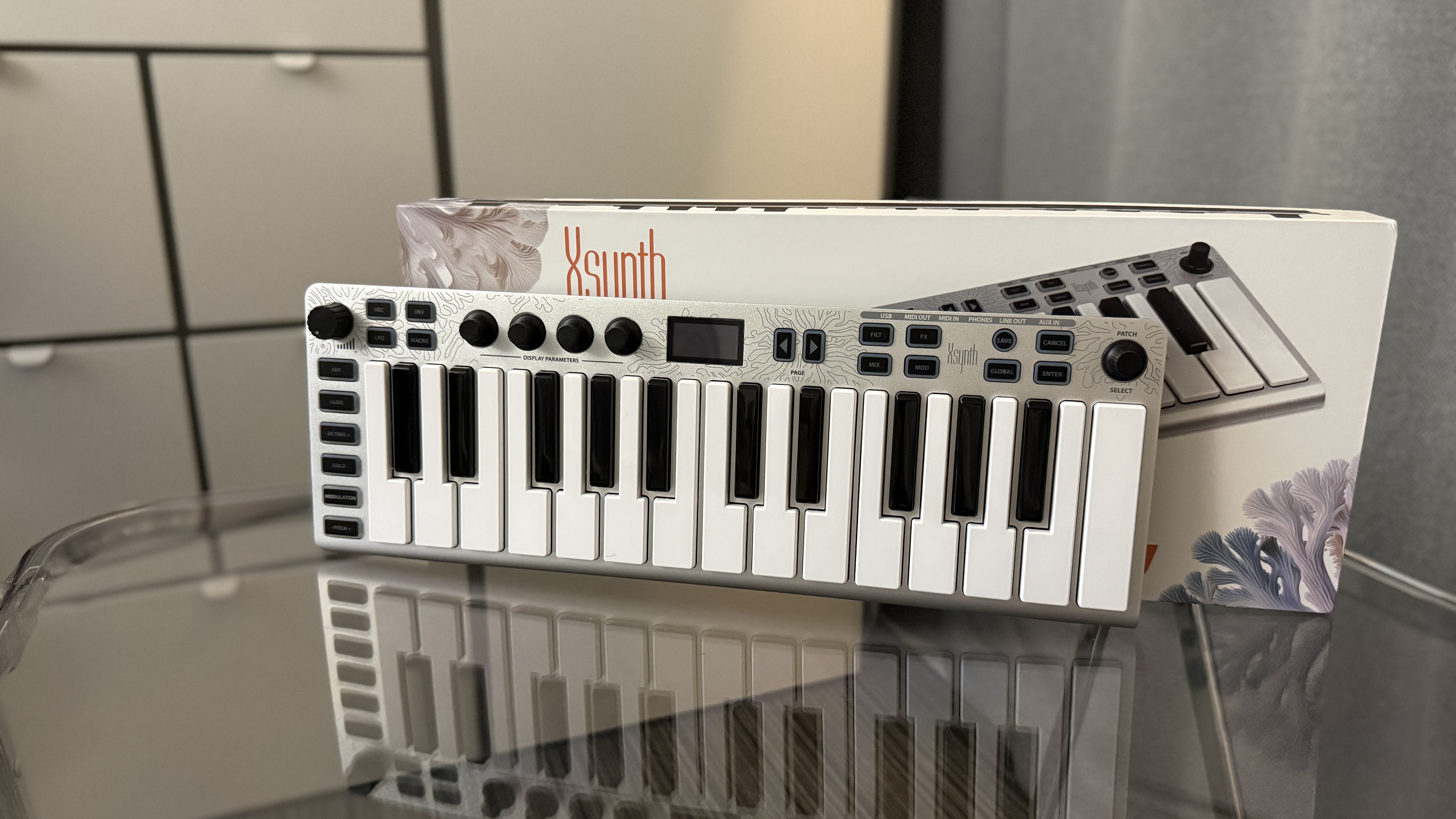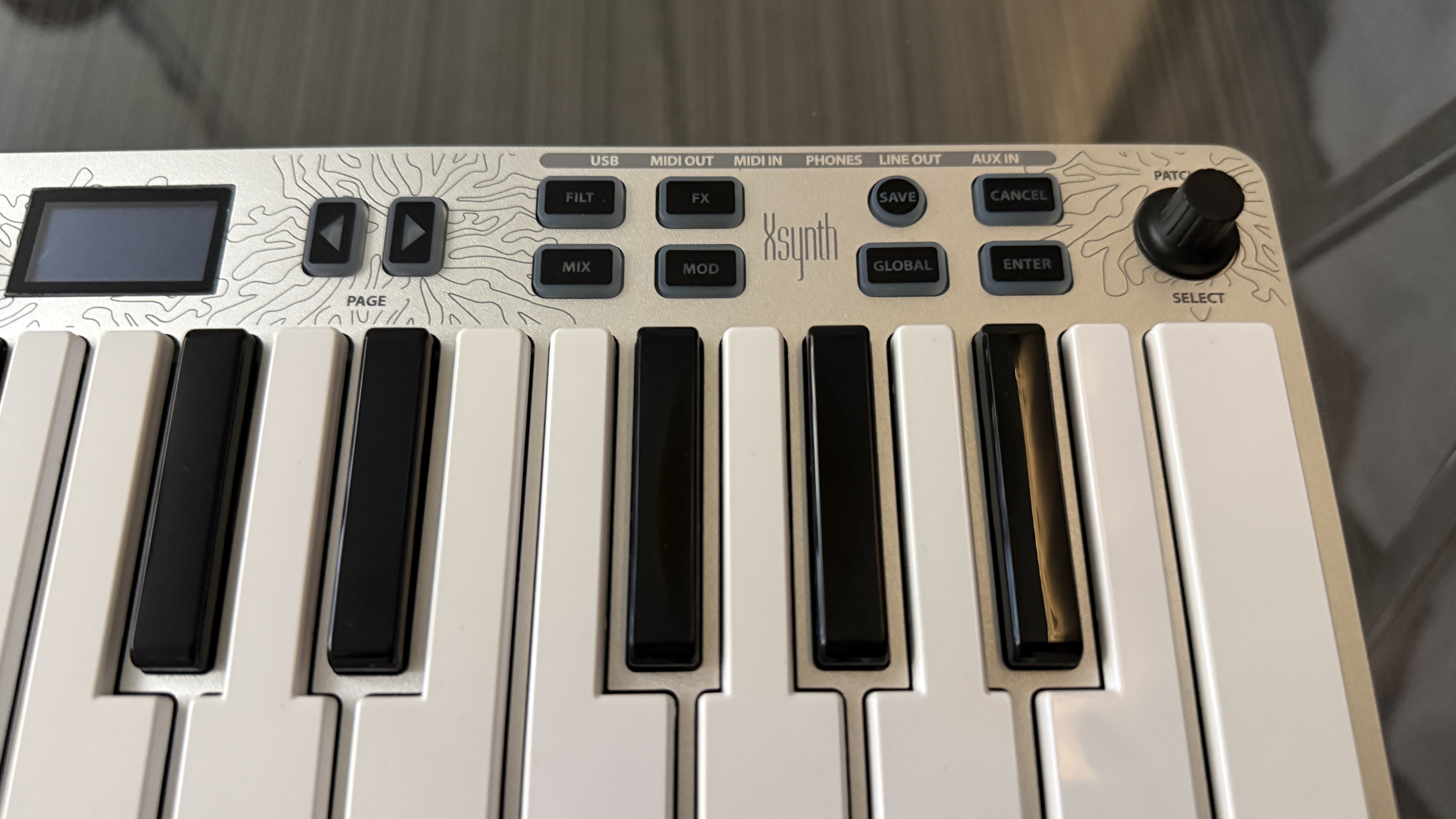 그럼 Xsynth를 한번 천천히 살펴보도록 하자. 첫인상은 "이게 신디사이저가 맞나?"였다. 적어도 오밀조밀하게 되어 있던 OP-1과 다르게 이미 있던 Xkey를 기반으로 만든 신디사이저기에 전반적으로 신디사이저라기보단 마스터 키보드의 느낌이 조금 더 강하게 든다. 여전히 아노다이징 알루미늄을 사용하고 있고, 건반도 크게 달라진 점이 없어 더더욱 그런 생각이 강하게 들었다. 이전과 다르게 상단부 알루미늄 프레임에 기하학적 무늬가 조금씩 들어가 있는데, 생각보다 잘 어울린다는 느낌이다. 처음 보고 다마스쿠스 강 특유의 무늬인 줄 착각했다.
