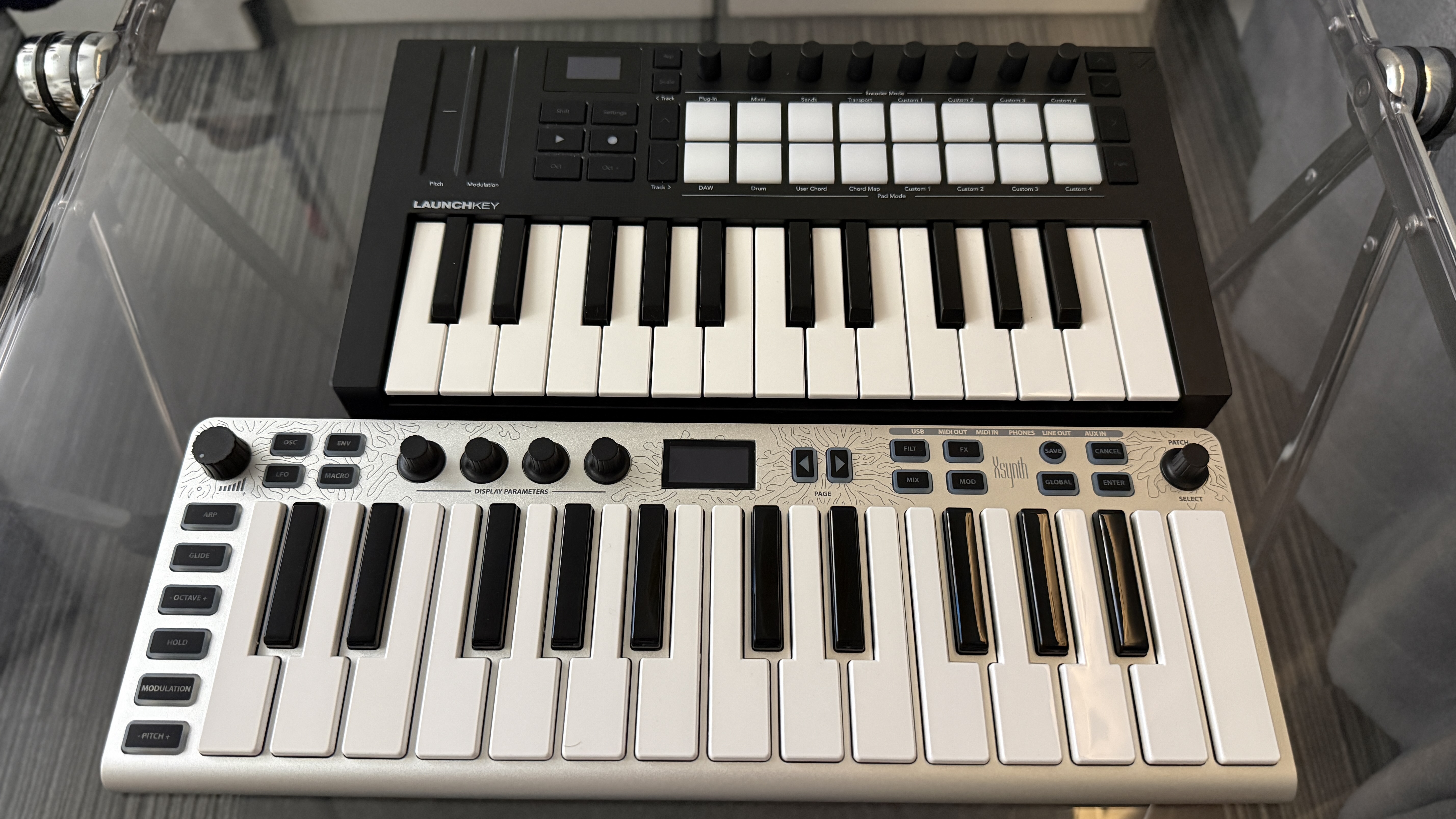 그런데 자세히 보니 키베드 간격이 약간 차이가 있다. 둘 다 미니 건반을 사용하고 있어 상대적으로 작은 넓이의 키베드를 사용하고 있는데 Xsynth가 약간의 여유를 주었기에 조금 더 넓은 공간을 가지고 있다. 물론 크기가 큰 만큼 상대적으로 연주하기에는 조금 더 편하다.