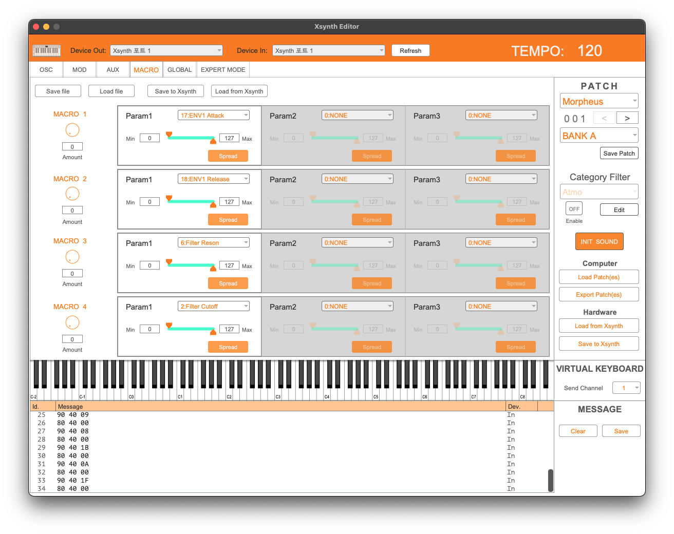 네 번째 항목은 MACRO, 즉 자주 사용하는 파라미터를 한 번에 조작 가능한 매크로다. Xsynth에서는 총 12페이지로 구성되어 있던 화면이 Xsynth Editor에서는 광활하게 사용할 수 있다. Serum을 써 본 분이라면 어디선가 본 그거 맞다. 여러 값들을 하나의 노브로 조작할 수 있어 공연이나 라이브 등에 사용하기 좋다. 있을 건 다 있다.