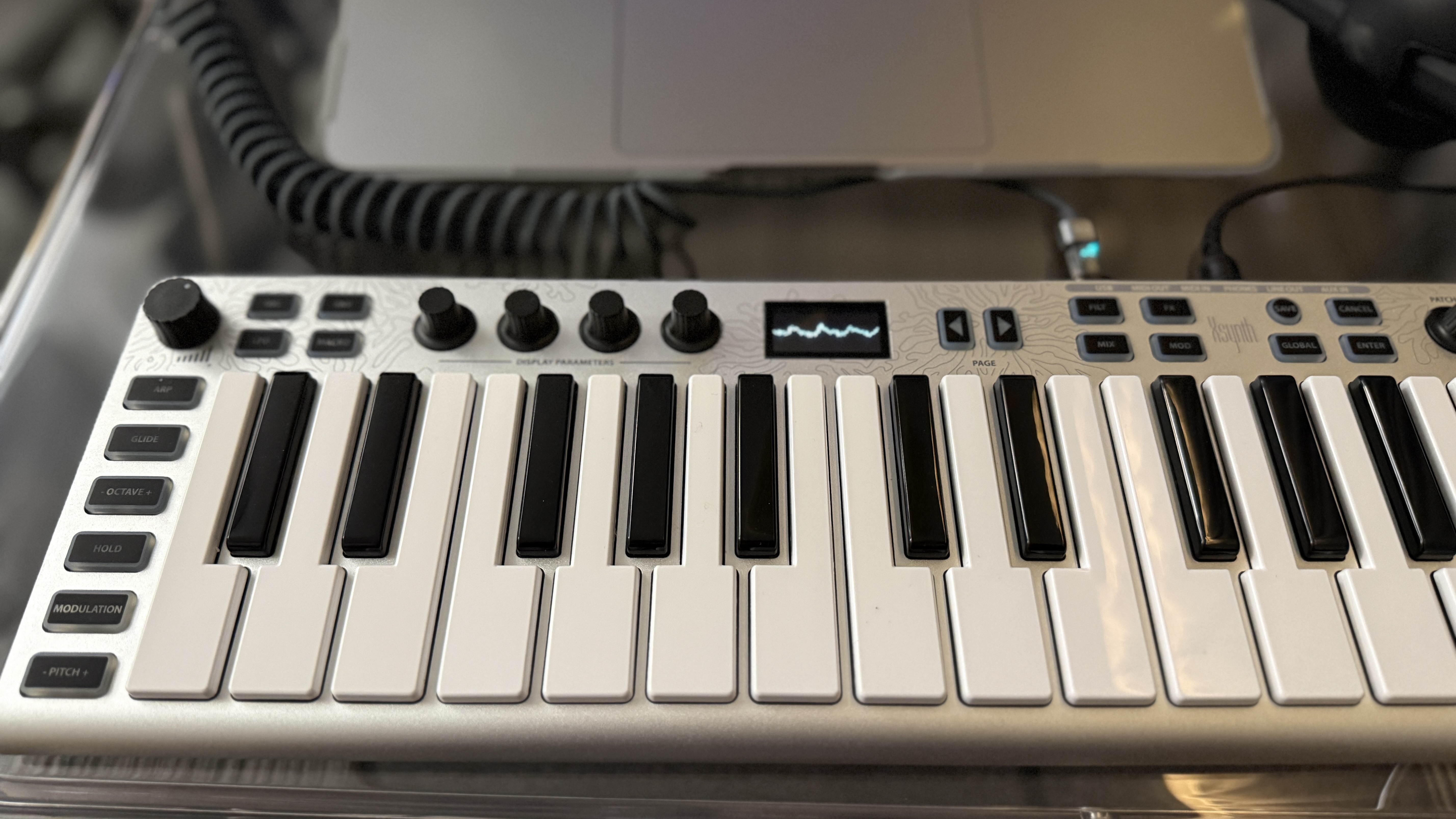 크게 바뀐 점이 보이지 않는 Xsynth지만 천천히 살펴보면 엄청난 변화들이 가득하다. 먼저 상단부에 오실레이터, 엔벨롭, LFO, 매크로 설정을 위한 기능 키와 파라미터 조정용 노브, 그리고 전원 스위치를 겸하는 볼륨 노브가 추가되었다. 좌측에도 Xkey에 없던 아르페지오, 글라이드 버튼이 추가되었다. 압력 감지 모듈레이션 및 피치 버튼은 여전히 건재하다.