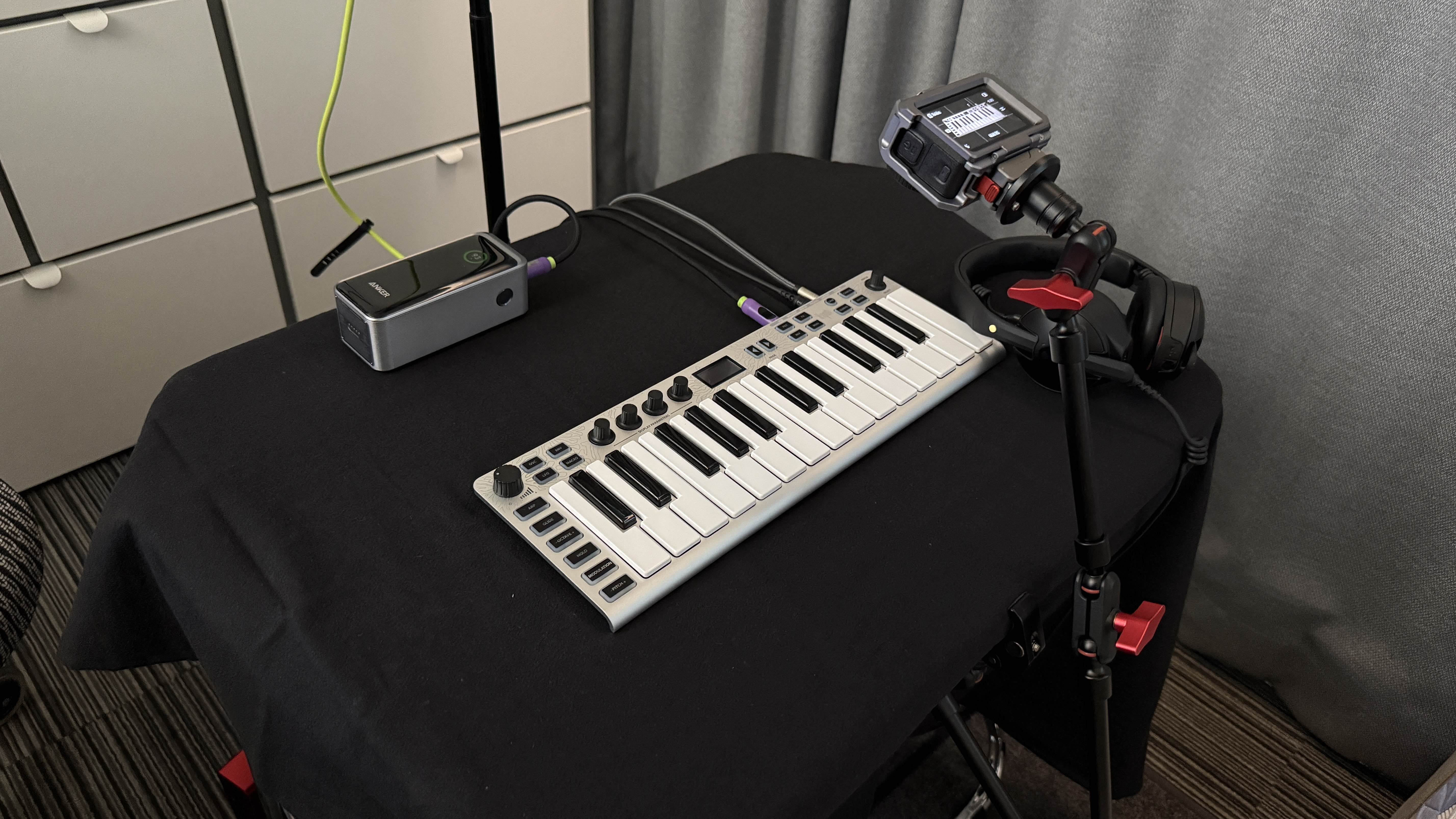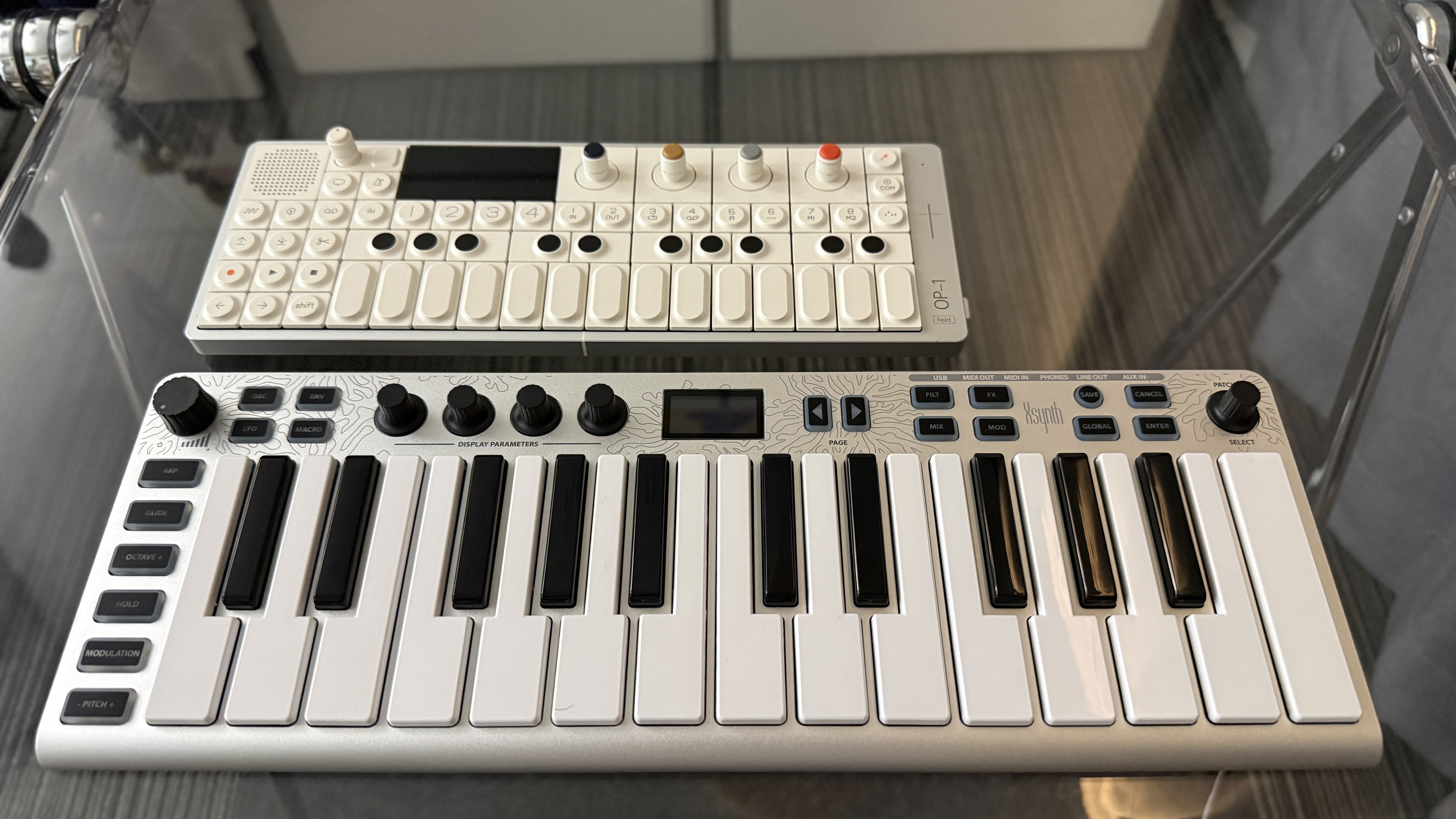 그럼 휴대성이 얼마나 좋은지 한번 비교 시간을 가져볼까 한다. 첫 번째는 필자의 지인으로부터 빌려온 OP-1 Field다. 이전에 필자가 소개했던 OP-1의 개선판으로 휴대용 신디사이저 끝판왕이라고 불리는 미니 건반이자 신디사이저다. 사실 컨셉 자체도 거의 동일하다. 다만 OP-1 Field는 내부에 배터리가 들어 있어 별도의 외장 전원 없이도 작동이 가능하지만 Xsynth는 USB 전원을 공급해야 사용할 수 있다.