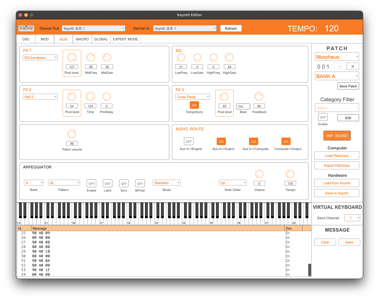 세 번째 항목은 AUX, 즉 FX 및 아르페지오, 오디오 라우팅과 관련된 기능들이 모여 있다. 작은 사이즈임에도 불구하고 FX를 4개나 동시에 사용할 수 있는데 생각보다 지원하는 FX가 많다. 2번은 EQ로 고정이고 3번은 리버브 종류, 4번은 딜레이 종류를 선택할 수 있는 반면 1번 FX는 EQ 밴드패스, 디스토션, 컴프레서, WahWah, 그리고 LoFi까지 6개의 FX를 취사선택하여 사용할 수 있다. 즉 Xsynth에서 지원하는 이펙터는 총 9개인 셈이다. 특정 슬롯들이 고정된 점은 아쉽지만 이 정도나 지원해 준다는 점이 심히 놀랍다.