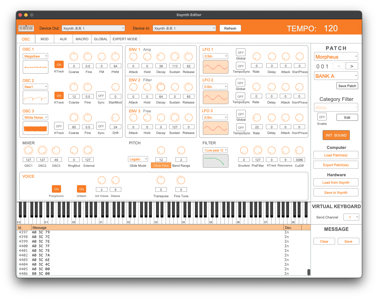 USB를 컴퓨터에 연결한 상태에서 Xsynth Editor를 실행하게 되면 약간의 미디 메시지가 지나가면서 곧 Xsynth의 현재 프리셋과 뱅크가 Xsynth Editor에 표시된다. 이제 작은 화면에서 벗어나 가상 악기를 조작하듯이 신디사이저를 조작할 수 있다.