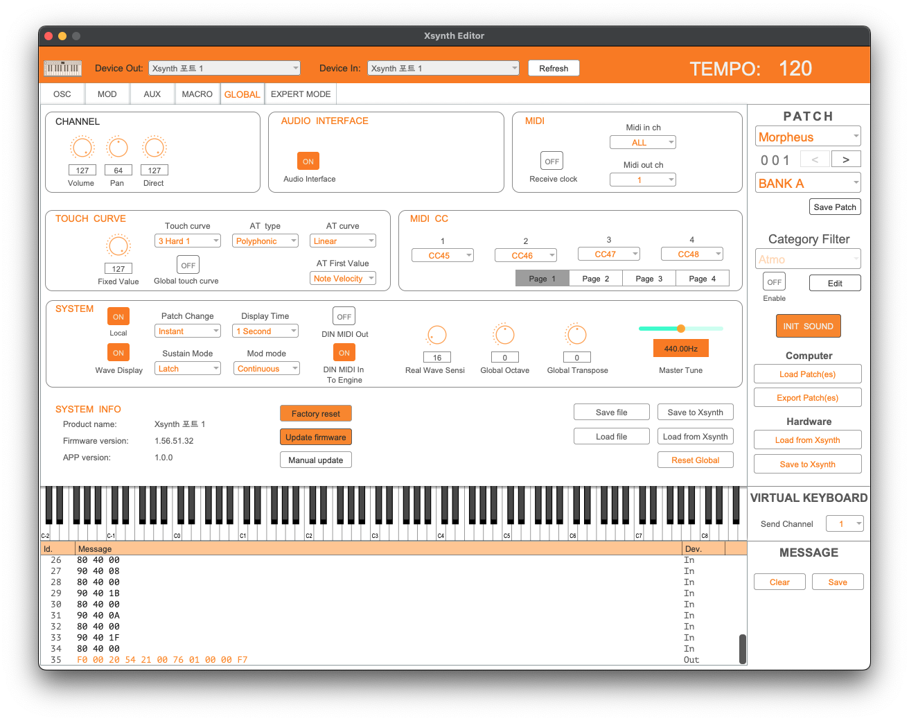 다섯 번째 항목은 GLOBAL, 어느 신디사이저에서 다 볼 수 있는 기본 설정들이 모여 있는 곳이다. 채널 볼륨 및 패닝, 다이렉트 출력 등 기본적인 기능부터 건반 터치 커브 간단 조정, 다른 장비를 제어할 수 있는 MIDI CC 출력, 오디오 인터페이스 활성화 유무, 그리고 Xsynth의 펌웨어 업데이트를 여기서 조절 및 진행할 수 있다.