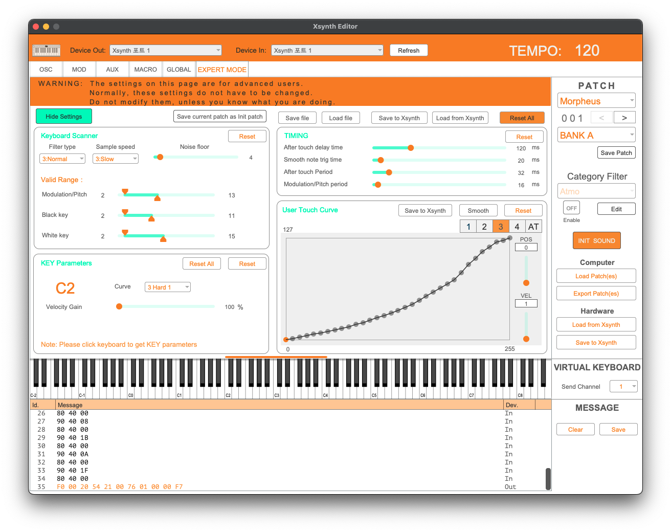 마지막으로 Expert Mode라 해서 보다 디테일한 부분들을 하나하나 수정하고 싶은 분들을 위한 기능이 마련되어 있다. 기본적으로 설정값이 숨겨져 있으며 "지금 무엇을 하고 있는지 명확히 알고 있을 것"이라는 경고 문구가 같이 출력된다. 기능을 활성화하면 뭔 이런 것까지 설정할 수 있는지 당황할 정도로 다양한 값들을 조절할 수 있다. 샘플 스캔 속도부터 벨로시티 게인 조정, 애프터 터치 및 모듈레이션/피치 정도, 키보드 터치 커브 등 디테일한 값들을 조절할 수 있게 되어 있다. 일반적으로 잘 만지지 않을 기능이지만 자신이 Xsynth를 보다 잘 쓸 수 있는지를 조작하고 싶은 신디사이저 전문가들을 위한 옵션이라 할 수 있다. 숨겨져 있던 이유가 다 있다.