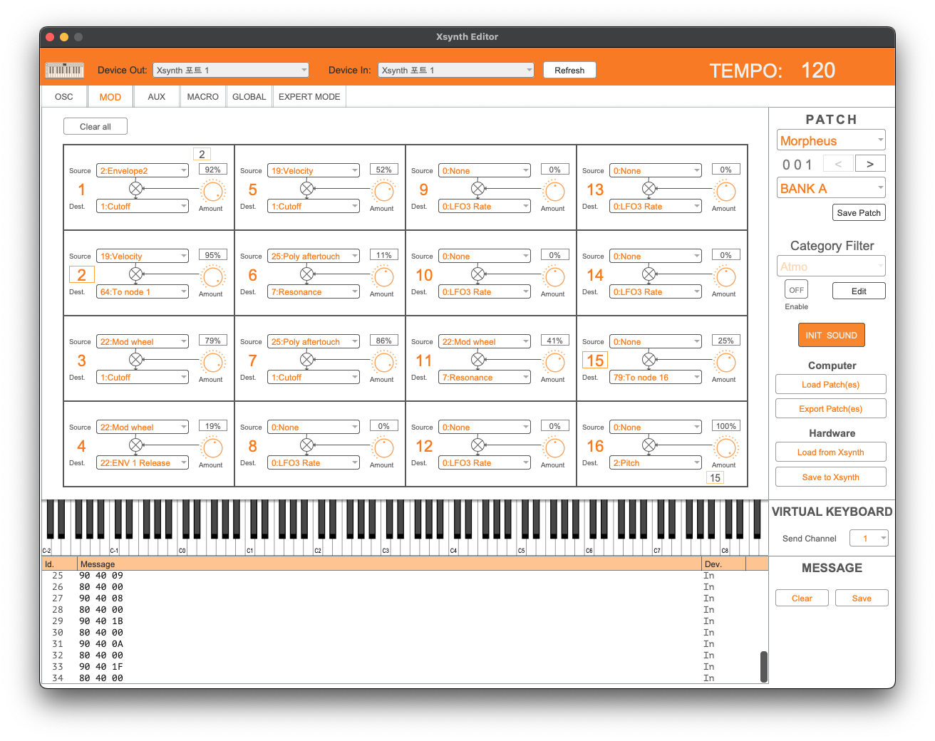 두 번째 항목은 Mod, 즉 모듈레이션이다. 한 번에 4개의 모듈레이션, 총 16개의 모듈레이션을 사용할 수 있다. 특정 값에 반응해서 다른 값을 변화하는 모듈레이션은 VST 신디사이저를 조금이라도 다뤄본 분이라면 쉽게 이해할 수 있게 설계되어 있다. Xsynth 내부에서는 총 4페이지로 구성되어 있어 컴퓨터를 이용해 편집하는 게 편리하다. 다시 한번 크기는 작아도 Xsynth가 제대로 된 신디사이저라는 걸 깨닫게 된다.