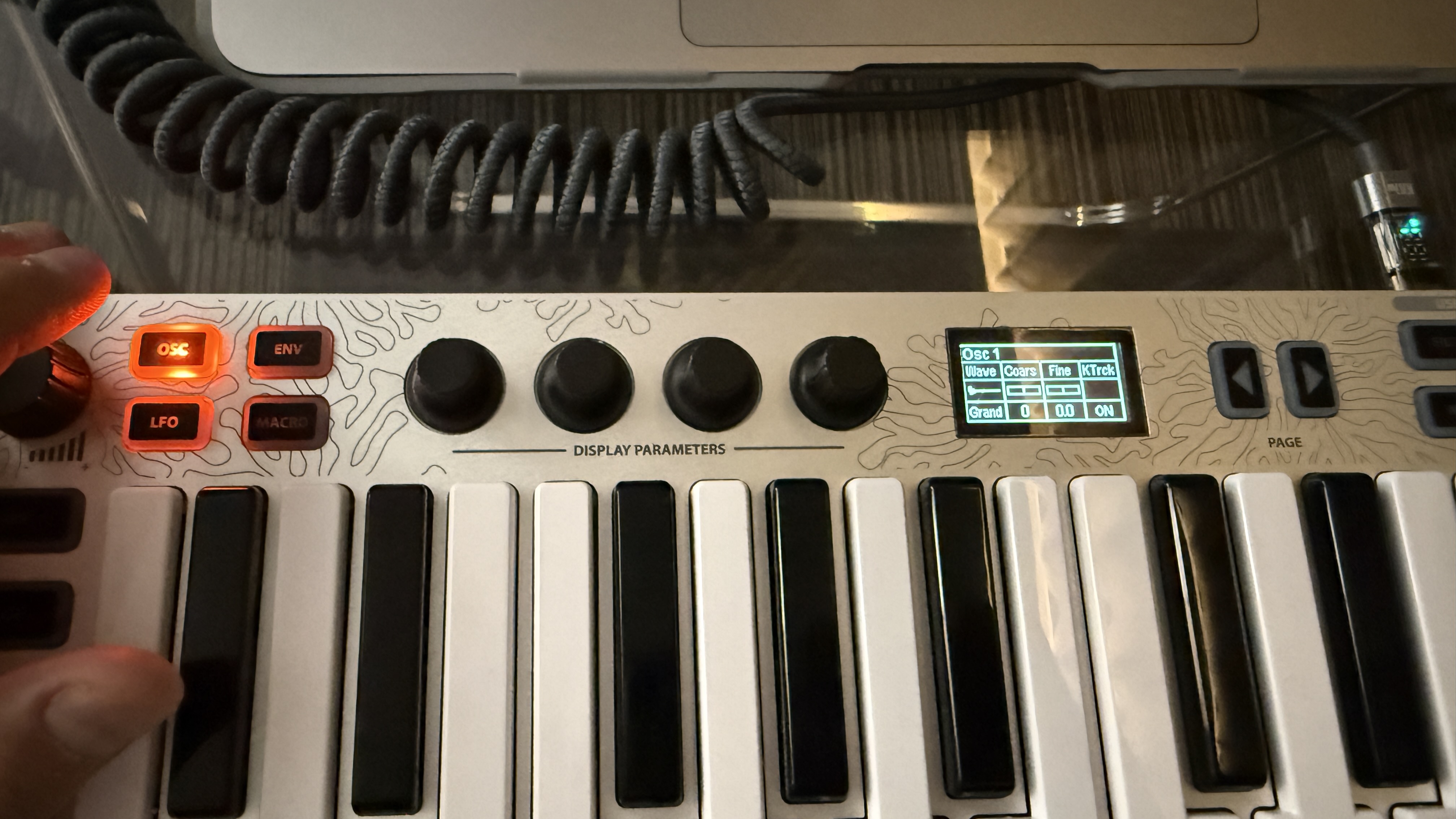 이제 Xsynth에 전원을 넣어볼 시간이다. USB-C 단자에 전원을 연결하고 볼륨 노브를 돌리면 중간의 디스플레이에 빛이 들어오며 Xsynth가 켜진다. 전원이 켜진 이후에는 바로 신디사이저를 조작하면서 연주가 가능하다.