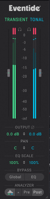 우측에는 2개의 미터가 있다. 하나는 Transient, 다른 하나는 Tonal의 미터다. 둘의 색이 다르기 때문에 쉽게 차이를 확인할 수 있다. 둘의 레벨을 따로따로 솔로잉할 수도 있고 패닝 할 수도 있고, 서로 다른 출력을 줄 수도 있다. EQ 스케일까지 따로 정할 수 있어서 편리하다.