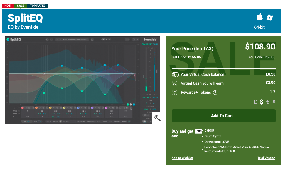 Eventide SplitEQ 구매 링크 (PluginBoutique)를 클릭하거나, Plugin Boutique(링크)에 접속한 후, 검색창에 "SplitEQ"를 검색하면 위와 같은 화면이 나타난다. Plugin Boutique는 회원 가입을 하지 않아도 상품 구매가 가능하지만, 회원 가입을 하는 편이 추후 라이센스 관리에 용이하다. 기본값은 파운드화로 나타나지만 달러나 엔, 유로화로 가격을 바꿔가며 확인할 수 있다. 다만, 대한민국 원은 지원하지 않으므로 해외 결제가 지원되는 카드나 페이팔 계정을 미리 준비할 필요가 있다. Add to Cart를 클릭하여 상품을 내 장바구니로 담자.