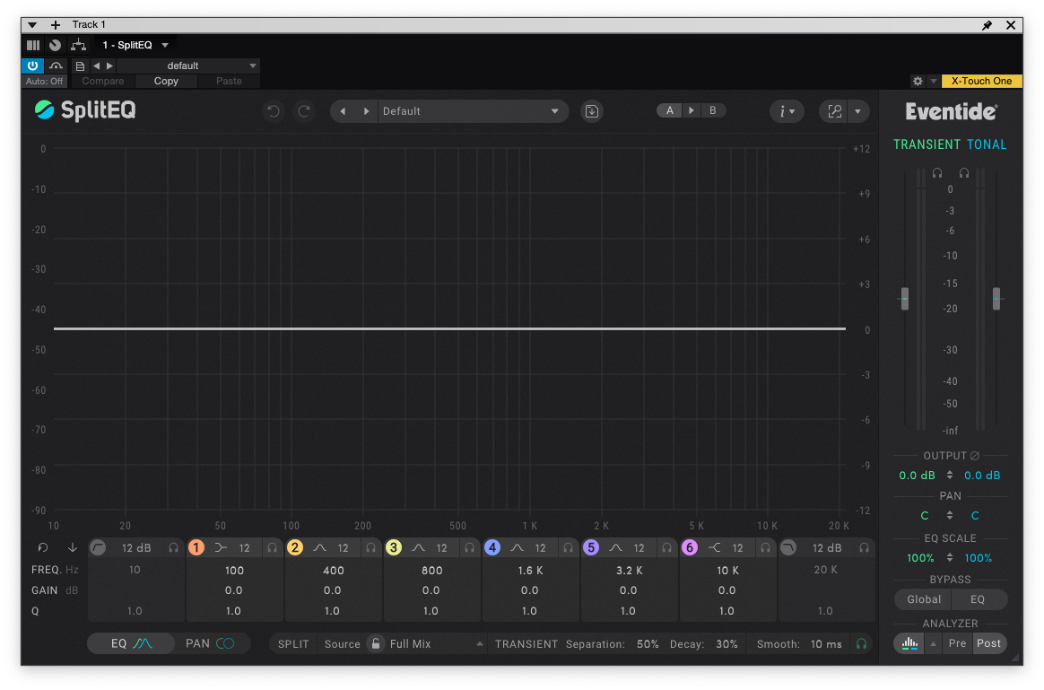 그럼 SplitEQ의 각 요소들을 하나씩 살펴보도록 하겠다. 사실 SplitEQ의 디자인은 다른 EQ와 크게 다른 점이 없다. 요즘의 디지털 EQ에서 흔히 볼 수 있는 주파수 비주얼라이저가 있고, 여기에 EQ의 커브를 시각적으로 확인할 수 있다. 다만 다른 EQ와 달리 Transient와 Tonal 기능이 추가되어 있기에 고유한 2개의 색으로 표시된다. 녹색 계열의 커브는 Transient, 파란색이 들어간 커브는 Tonal 커브다. 시각적으로 명확히 나뉘어 있어 구분도 편하다.