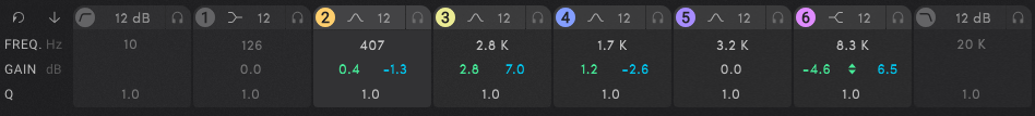하단의 밴드 미터 또한 Transient와 Tonal이 서로 다르게 나뉘어 있다. 색으로 Transient와 Tonal을 구분하면 된다. Transient와 Tonal의 게인값 및 Q값을 서로 다르게 줄 수 있어 자유도가 높다. 다만 주파수 값은 공유한다.