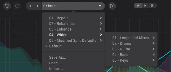 EQ가 다 같은 EQ지 하는 사람들은 보통은 프리셋을 잘 살펴보지 않는다. 필자가 그러하기 때문이다. 그러나 생각보다 EQ의 프리셋을 살펴보면 배울 점들이 많이 보인다. SplitEQ의 프리셋도 그러하다. 프리셋 자체는 평범한 편인데, 음원 복구와 밸런스, 그리고 강화, 이미지 확장 등에 초점이 맞춰져 있다. 프리셋을 하나씩 골라서 직접 사용해 보자.