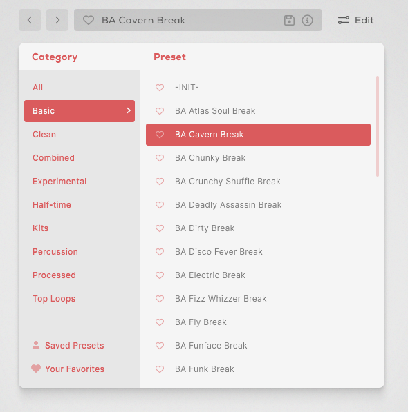 만일 직접 드럼 루프를 만들기 귀찮다면 미리 만들어진 프리셋을 사용해 보자. 필자가 글을 작성하면서 다른 사람들에게 Bloom Drum Breaks를 보여줄 일이 생겼는데, 생각지도 못한 리듬 패턴에 놀랐다. Bloom Drum Breaks의 프리셋에는 이러한 창의적인 브레이크비트 드럼 루프들이 가득하다. 필자가 추천하는 프리셋은 Kits 밑에 있는 프리셋이다. 바로 꺼내서 내 음악에 적용할 수 있을 정도로 정말 마음에 든다.