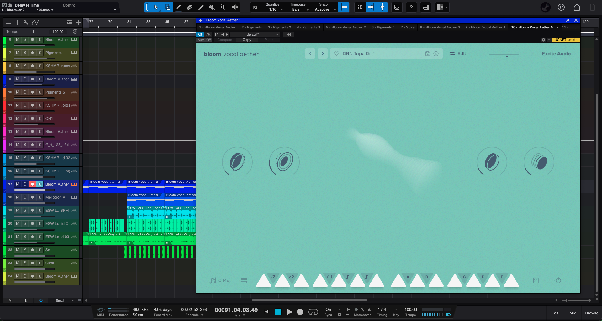 Excite Audio - Bloom Vocal Aether을 설치한 후, DAW를 실행하면, 다음과 같이 정상적으로 플러그인이 설치된 걸 확인할 수 있다. Excite Plugin의 플러그인들은 최근에 개발되었기에 VST3, AU, AAX, Standalone 소프트웨어 등을 지원해 대다수의 DAW에서 정상적으로 실행할 수 있다. 필자의 경우 VST3을 선호하기 때문에, 다른 것들은 전부 숨김 처리하고 사용하고 있다.
