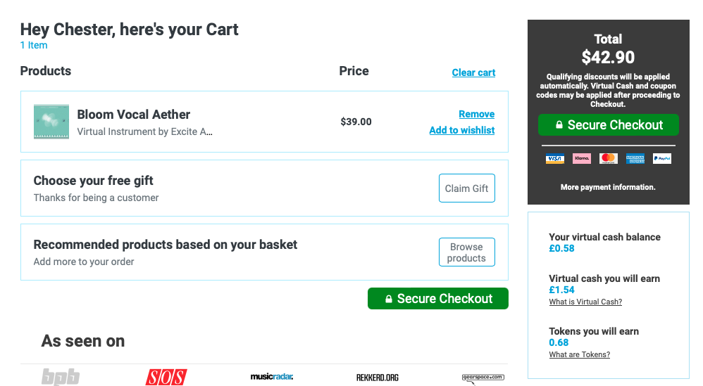 홈페이지 상단 우측에 자리 잡은 Cart를 누르면 다음과 같은 화면이 나타난다. 이 화면에서는 이번 구매로 적립되는 캐시, 구매로 적립되는 토큰을 확인할 수 있으며 상품 구매로 받을 수 있는 무료 선물을 선택할 수 있다. 만일 Plugin Boutique에서 처음 구매한다면 Claim Gift를 클릭해서 무료 선물을 받아가는 게 좋다. 플러그인 하나만 샀을 뿐인데 공짜로 다른 플러그인들도 가져갈 수 있다. 무료로 받을 수 있는 플러그인들은 기간에 따라 다르니 미리 구매 전에 어떤 걸 무료로 주는지 체크해 보는 것도 좋다. 모든 작업이 완료되었다면 초록색 "Secure Checkout"을 눌러 다음 화면으로 넘어가자.