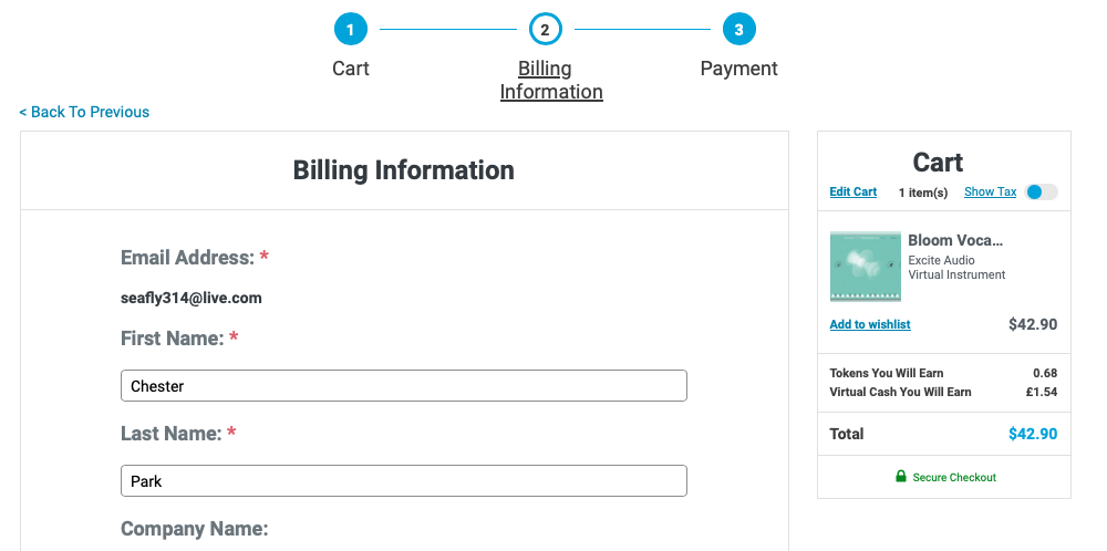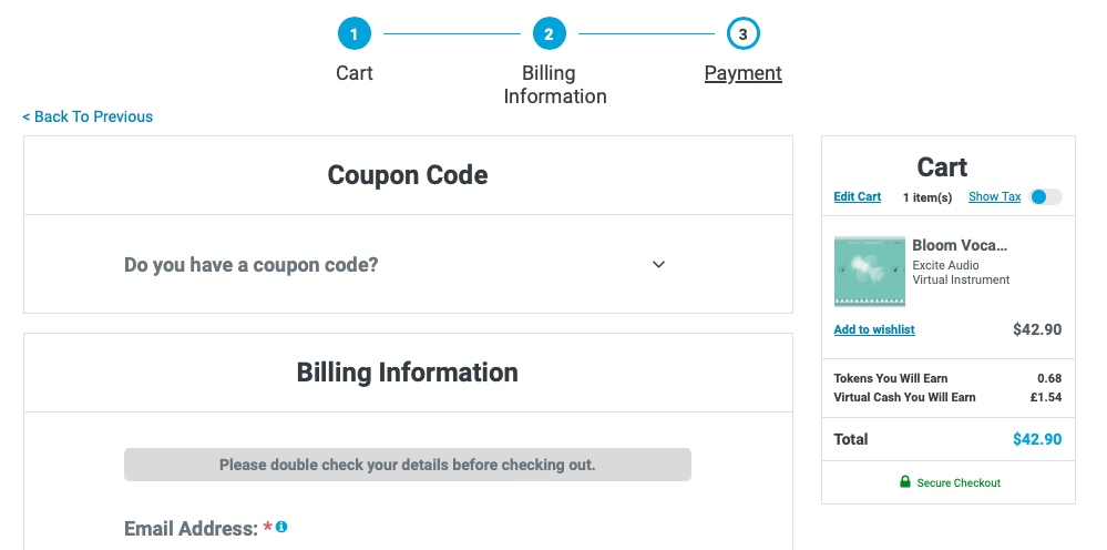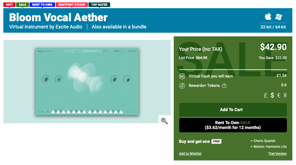 Excite Audio Bloom Vocal Aether 구매 링크 (PluginBoutique)를 클릭하거나, Plugin Boutique(링크)에 접속한 후, 검색창에 "Excite Audio Bloom Vocal Aether를 검색하면 위와 같은 화면이 나타난다. Plugin Boutique는 회원 가입을 하지 않아도 상품 구매가 가능하지만, 회원 가입을 하는 편이 추후 라이센스 관리에 용이하다. 기본값은 파운드화로 나타나지만 달러나 엔, 유로화로 가격을 바꿔가며 확인할 수 있다. 다만, 대한민국 원은 지원하지 않으므로 해외 결제가 지원되는 카드나 페이팔 계정을 미리 준비할 필요가 있다. Add to Cart를 클릭하여 상품을 내 장바구니로 담자.
