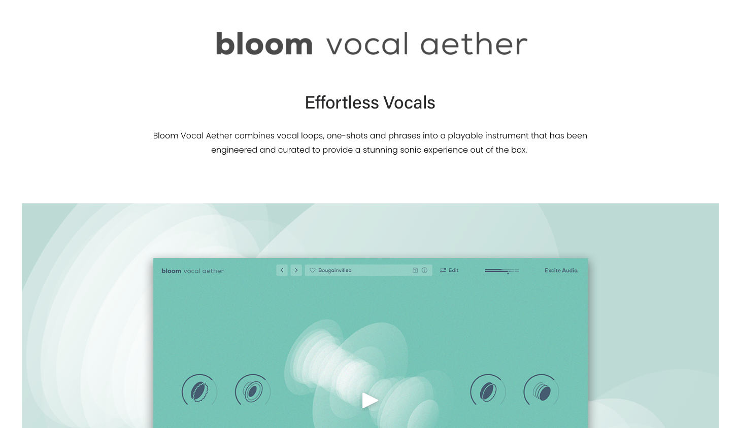 PluginBoutique에서 소개를 부탁한 이번 플러그인은 Excite Audio의 Bloom Vocal Aether라는 플러그인이다. 막 나온 따끈따끈한 신작이다. Excite Audio는 최근 들어서 자주 모습을 보이고 있는 개발사다. 이전에는 KSHMR와의 협업을 통해 같은 체인을 다른 트랙에도 쉽게 불러오고 동기화 할 수 있던 "KSHMR Chain"이라는 플러그인으로 참여한 바 있는데, 미터링 플러그인인 Vision 4X이라던가, motion:harmonics 같은 창의적인 이펙터들을 개발하면서 점점 이름을 알리고 있는 개발사다. 게다가 대부분의 제품 가격이 저렴해서 쉽게 구입할 만하다.