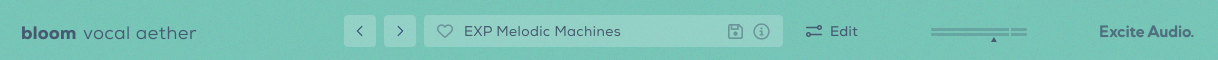 그럼 각 기능들을 조금 더 세부적으로 살펴보도록 하자. 상단바에는 Bloom Vocal Aether라는 이름과 현재 프리셋 이름, 샘플 에딧 모드, 아웃풋 게인, 그리고 제조사인 Excite Audio의 로고가 배치되어 있다. 전체적으로 깔끔한 구성이라 딱히 설명할 건덕지가 보이지 않는다. 샘플 에딧 모드의 경우, 하단에 따로 서술하고자 한다.