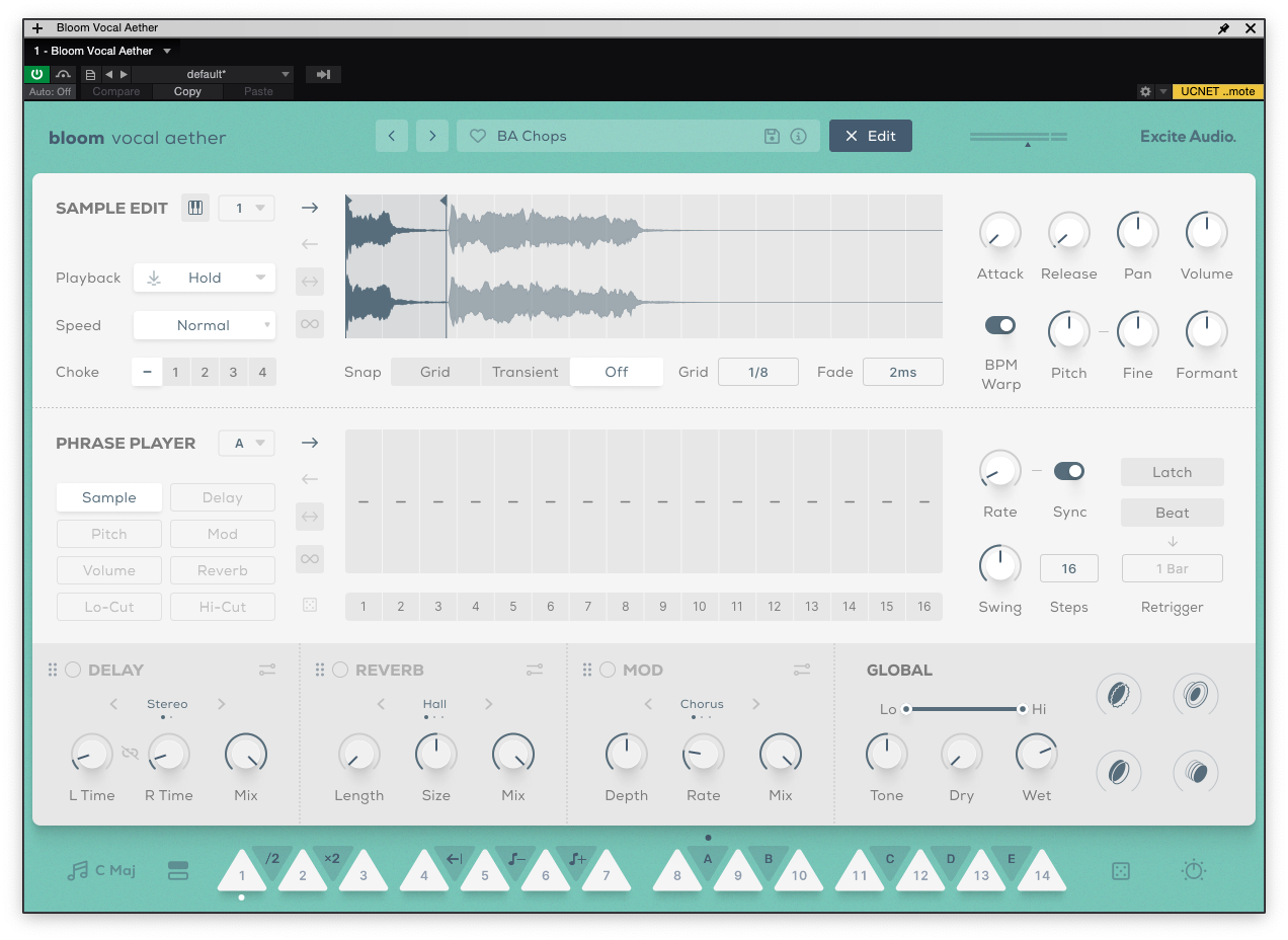 이번에 소개할 Excite Audio - Bloom Vocal Aether는 보컬 찹을 아주 쉽게 만들 수 있는 샘플러 기반의 가상 악기다. 각각의 건반에 샘플들을 넣어서 가공한 후 쉽게 연주할 수 있게 만들어준다. 거기에 부가적인 이펙터들을 더해서 독특한 느낌의 보컬 찹을 만들어낼 수도 있다. Bloom Vocal Aether는 두 가지 버전이 있는데, 모든 기능을 사용할 수 있는 Bloom Vocal Aether 일반 버전과, 샘플 뱅크 및 샘플 에디팅에 제한이 있는 Lite 버전으로 나뉜다. 간단하게 사용할 목적이라면 Lite 버전을, 내장되어 있는 샘플을 활용해 자신만의 보컬 찹을 만들고 싶은 분들은 일반 버전을 구입하면 된다. 가격은 Lite 버전이 19.99달러, 일반 버전이 39.99달러다. 가격 차이는 약 20달러 정도 나지만 기회가 된다면 일반 버전을 구입하는 게 심도 깊은 편집을 할 때 도움이 많이 된다.