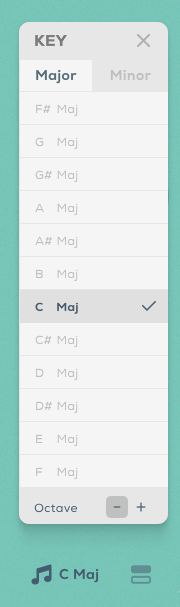 건반 뱅크 옆에는 현재 재생 중인 샘플 뱅크의 키를 설정할 수 있는데 메이저부터 마이너까지 폭넓게 설정할 수 있다. 이 부분은 간단한 부분이니 이런 것이 있다 하고 넘어가도 좋을 듯 하다.
