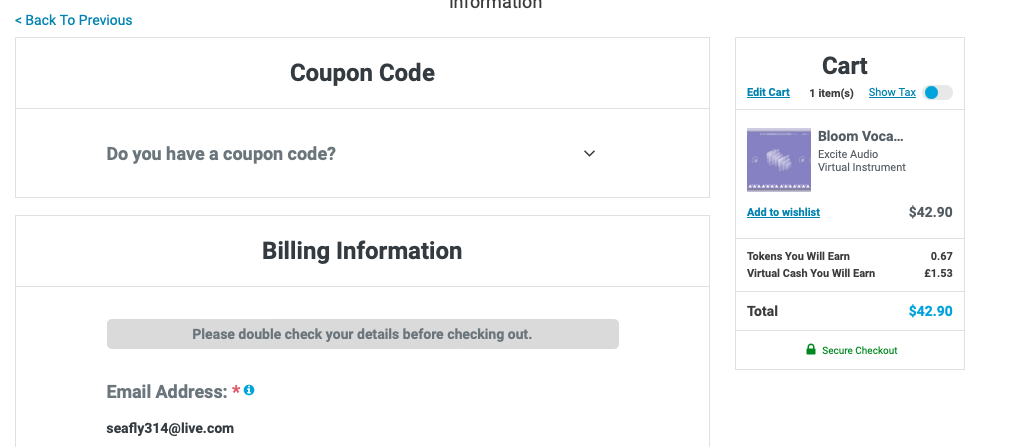 Excite Audio Bloom Vocal Edit 구매 링크 (PluginBoutique)를 클릭하거나, Plugin Boutique(링크)에 접속한 후, 검색창에 "Excite Audio Bloom Vocal Edit를 검색하면 위와 같은 화면이 나타난다. Plugin Boutique는 회원 가입을 하지 않아도 상품 구매가 가능하지만, 회원 가입을 하는 편이 추후 라이센스 관리에 용이하다. 기본값은 파운드화로 나타나지만 달러나 엔, 유로화로 가격을 바꿔가며 확인할 수 있다. 다만, 대한민국 원은 지원하지 않으므로 해외 결제가 지원되는 카드나 페이팔 계정을 미리 준비할 필요가 있다. Add to Cart를 클릭하여 상품을 내 장바구니로 담자.