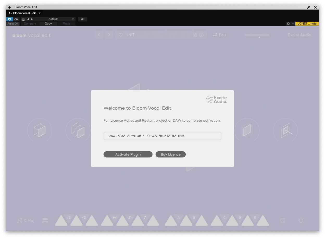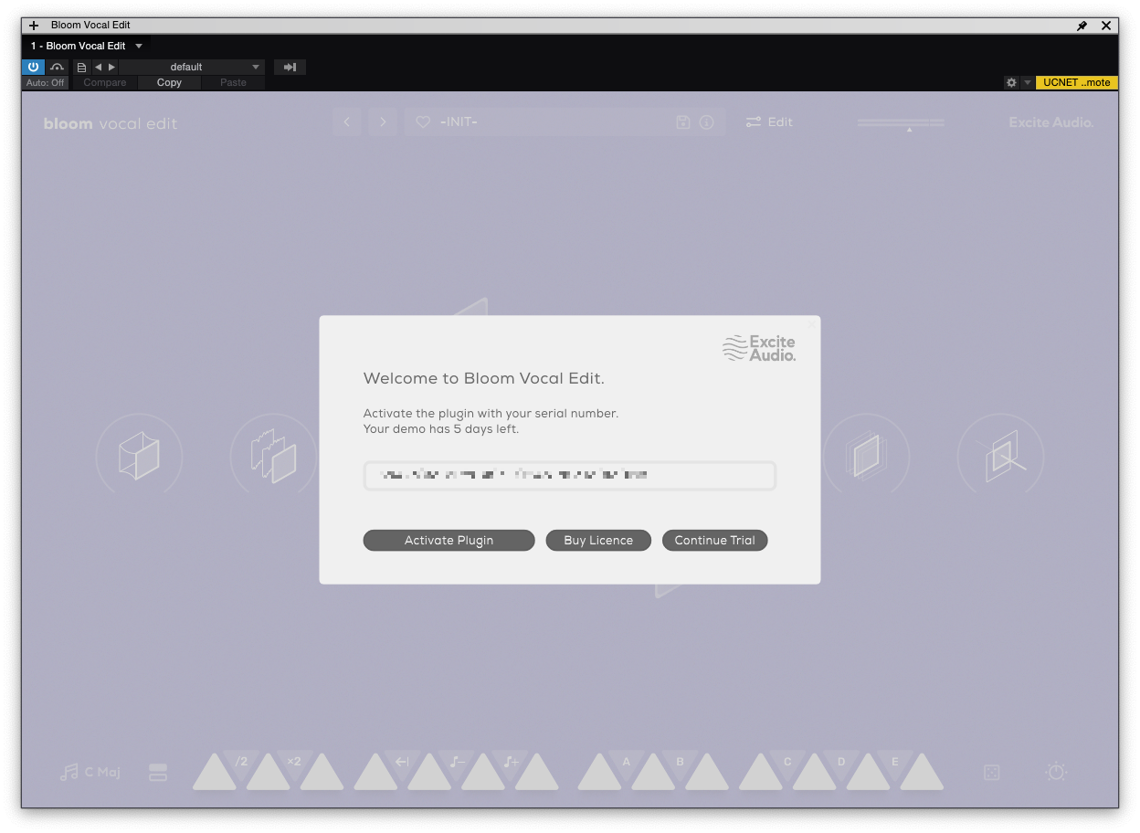 이제 시리얼을 등록해 보자. 설치 과정 자체는 평범하게 프로그램을 설치하는 것과 다르지 않다. 여차저차 Bloom Vocal Edit을 설치한 후 DAW에서 불러오면 다음과 같은 화면이 나타나게 된다. 여기서 시리얼을 가지고 있는 사람은 "Activate Plugin", 만약 살 생각이 있는 분이라면 "Buy License", 일단 임시로 써보고 싶은 분이라면 "Continue Trial"을 선택하면 된다.