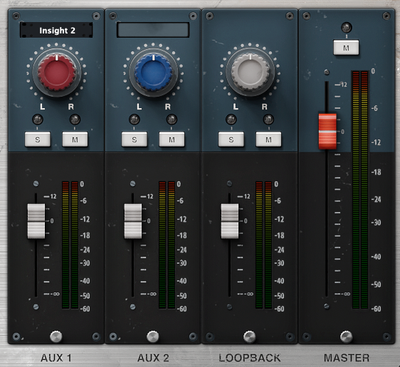 다음은 우측에 있는 AUX 채널 및 LoopBack 채널, 그리고 마스터 채널을 살펴보자. AUX 및 Loopback 채널은 앞서 보았던 Input 쪽과 거의 비슷하지만 AUX를 보낼 수 있는 노브가 없다. 솔로/뮤트 버튼 및 패닝 노브들을 보고 있으니 그냥 평범한 아날로그 믹서를 보는 느낌이다.