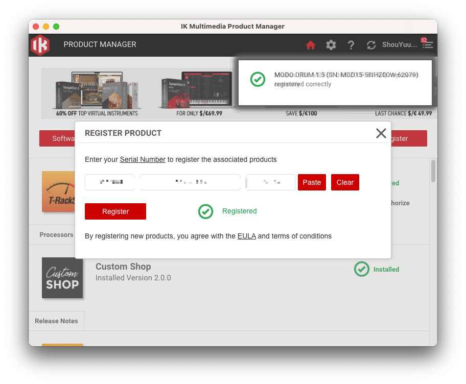그럼 PluginBoutique에서 발급받은 라이센스를 IK Multimedia에 등록할 차례다. IK Multimedia에 라이센스 등록을 하기 위해서는 IK Multimedia 계정이 필요하다. 또한 라이센스 관리 프로그램, "IK Product Manager"가 필요하다. IK Multimedia에 회원 가입 후, 컴퓨터에 IK Product Manager를 먼저 설치하자.
