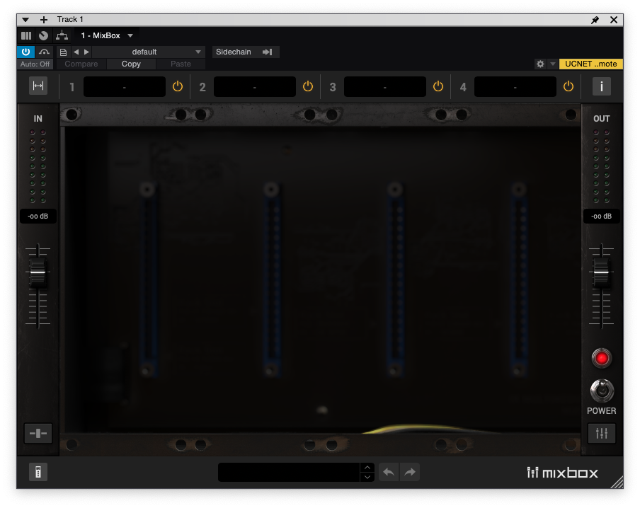 IK Multimedia Mixbox를 처음 켜게 되면 500 Rack 하드웨어의 모습이 먼저 반겨준다. 기본적으로 표시되는 건 4개의 슬롯이지만 확장을 하게 되면 8개의 슬롯까지 쓸 수 있다. 좌측에는 인풋 레벨 조절을 위한 페이더와 미터가 있고, 우측에는 아웃풋 레벨 조절을 위한 페이더와 미터가 있다. 그런데 이 상태에서는 아무것도 할 수 없다. 각 슬롯에 이펙터가 꽂혀 있지 않기 때문이다. 그럼 이펙터를 꽂아볼까 한다.