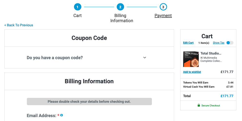 IK Multimedia Total Studio 4 MAX 구매 링크 (PluginBoutique)를 클릭하거나, Plugin Boutique(링크)에 접속한 후, 검색창에 "IK Multimedia Total Studio 4 MAX"를 검색하면 위와 같은 화면이 나타난다. Plugin Boutique는 회원 가입을 하지 않아도 상품 구매가 가능하지만, 회원 가입을 하는 편이 추후 라이센스 관리에 용이하다. 기본값은 파운드화로 나타나지만 달러나 엔, 유로화로 가격을 바꿔가며 확인할 수 있다. 다만, 대한민국 원은 지원하지 않으므로 해외 결제가 지원되는 카드나 페이팔 계정을 미리 준비할 필요가 있다. Add to Cart를 클릭하여 상품을 내 장바구니로 담자.