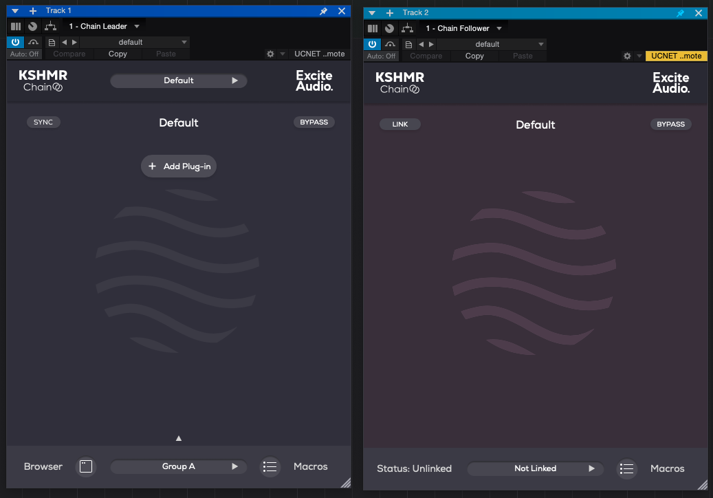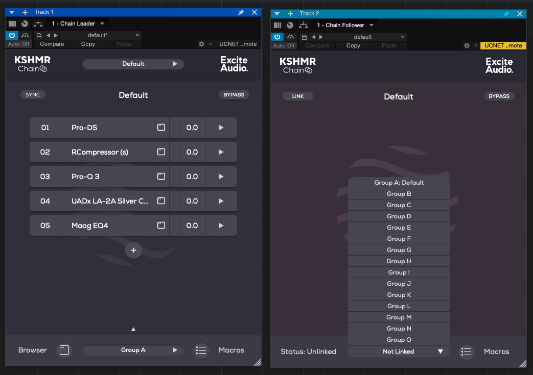 Leader에서 설정했던 플러그인 체인이 그대로 Follower에도 따라온 것을 확인할 수 있다. 심지어 필자가 임의로 설정한 Dry-Wet 값도 그대로 따라왔다. Leader에서 설정값이 바뀐다면 자동으로 Follower에도 적용된다. 이미지에서도 보이듯, Link가 걸려 있는 KSHMR Chain Follower에서는 플러그인 값을 직접 조절할 수가 없다. Leader에 적용된 설정을 그대로 받아와 현재 트랙에 적용해줄 뿐이다. 체인에 있는 플러그인 On/Off도 불가능하다. 물론 Unlink 버튼을 누른다면 Follower에서도 체인을 수정할 수 있다. 다만 Unlink 상태에서는 Leader의 값을 받아오지 않기 때문에 플러그인 체인 동기화 기능은 작동하지 않는다.