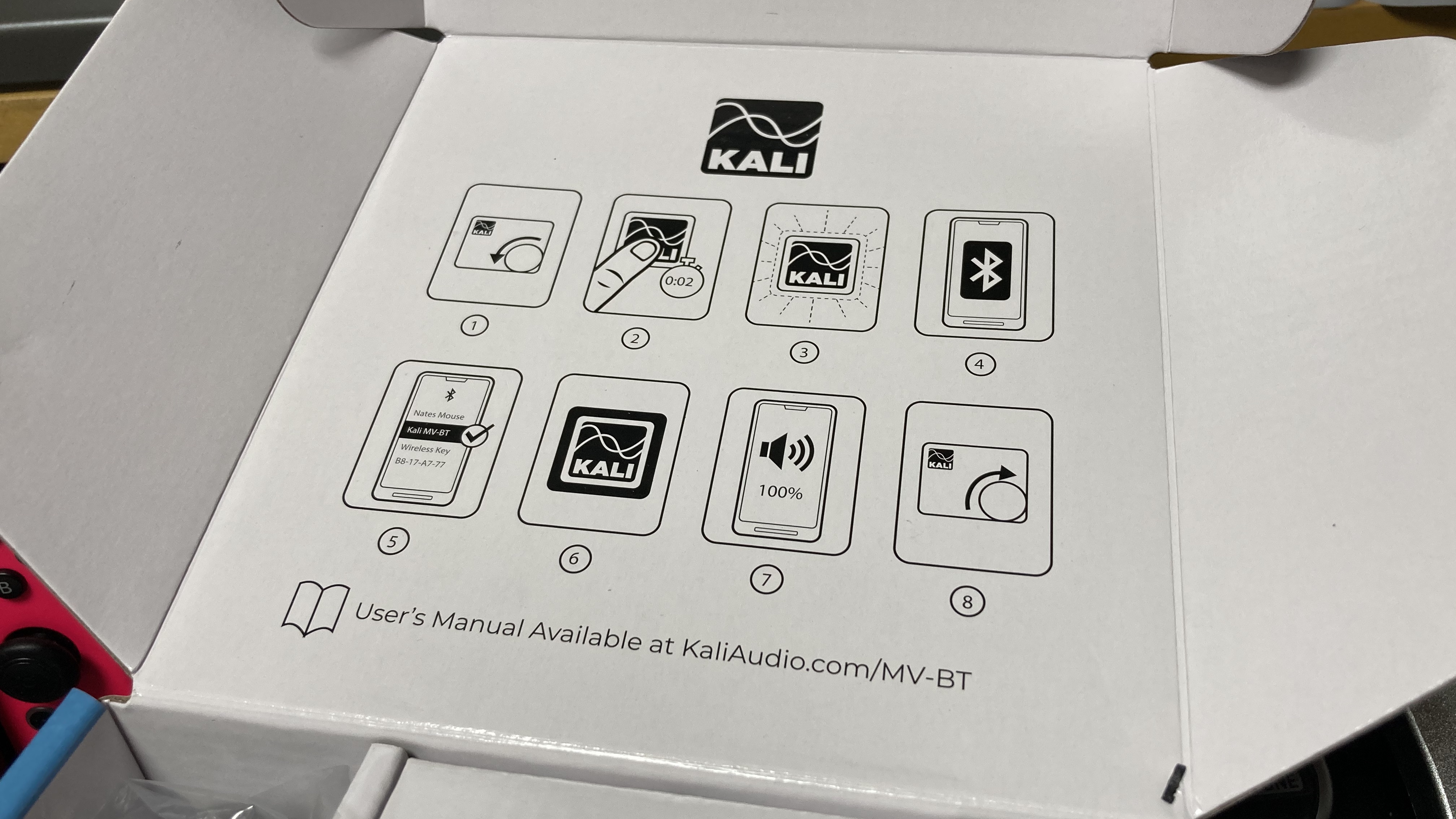 만일 블루투스 장비에 MV-BT가 잡히지 않는다면 픽토그램대로 천천히 따라 해 보자. Kali 로고를 2초 이상 눌렀다 떼면 Kali 로고의 LED가 깜빡거린다. LED가 깜빡거린다면 조그 다이얼을 돌려 볼륨을 최하로 낮추고 블루투스를 지원하는 전자기기에서 블루투스 장비 검색을 다시 해보자. 분명히 장비 리스트에 'Kali MVBT"가 나올 것이다.