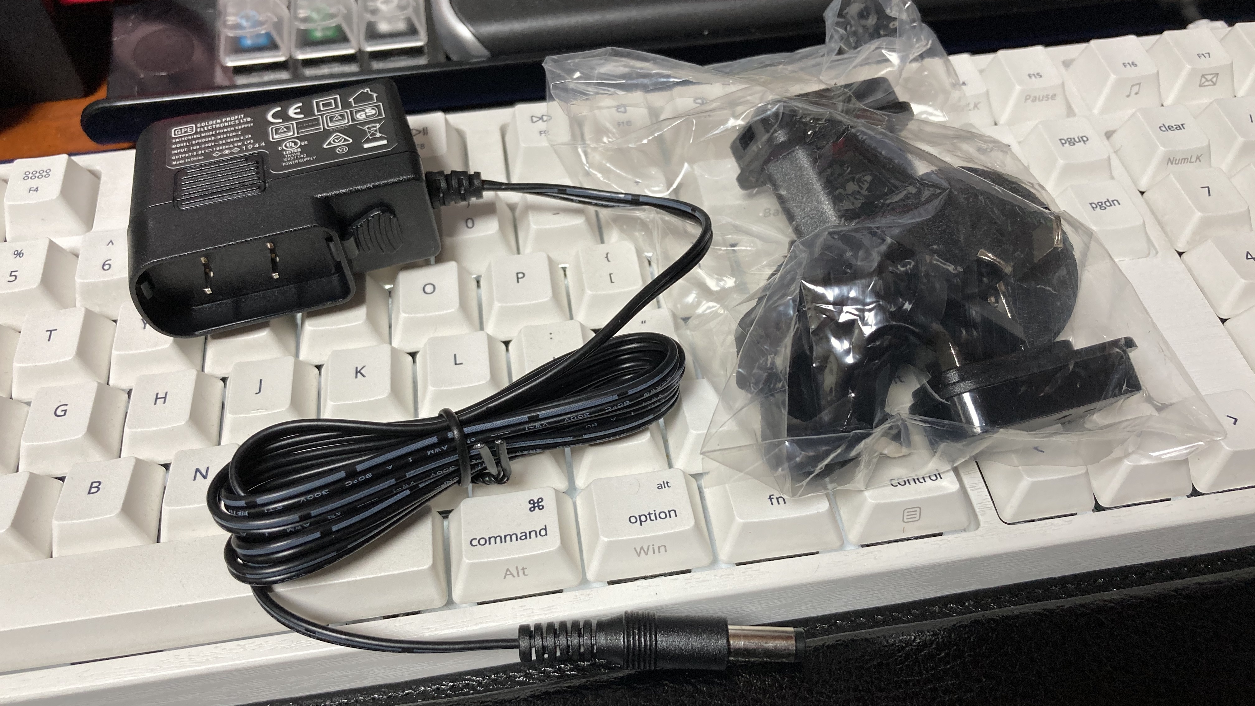 오늘의 주인공을 살펴보기 앞서, DC 어댑터가 박스 안에 있음에도 불구하고 안전사의 DC 어댑터가 들어있던 이유에 대해서 설명할까 한다. 번들 DC 어댑터는 영국, EU 표준, 미국 등에서 사용할 수 있게끔 플러그 헤드를 교체할 수 있게끔 설계되었다. 그러나, 번들로 주는 플러그 헤드 중에 한국 규격에 맞는 두꺼운 11자 형태의 플러그 헤드가 없다. 물론 EU 규격에 해당되는 11자 콘센트를 한국 콘센트에서 사용할 수는 있지만, 한국의 콘센트 규격보다 조금 얇게 되어 있어 합선 및 스파크가 발생할 우려가 있다. 원래대로라면 번들로 주어지는 DC 어댑터를 사용해야 하지만, 이 경우엔 부득이하게 안전사의 DC 어댑터를 사용하려 한다.