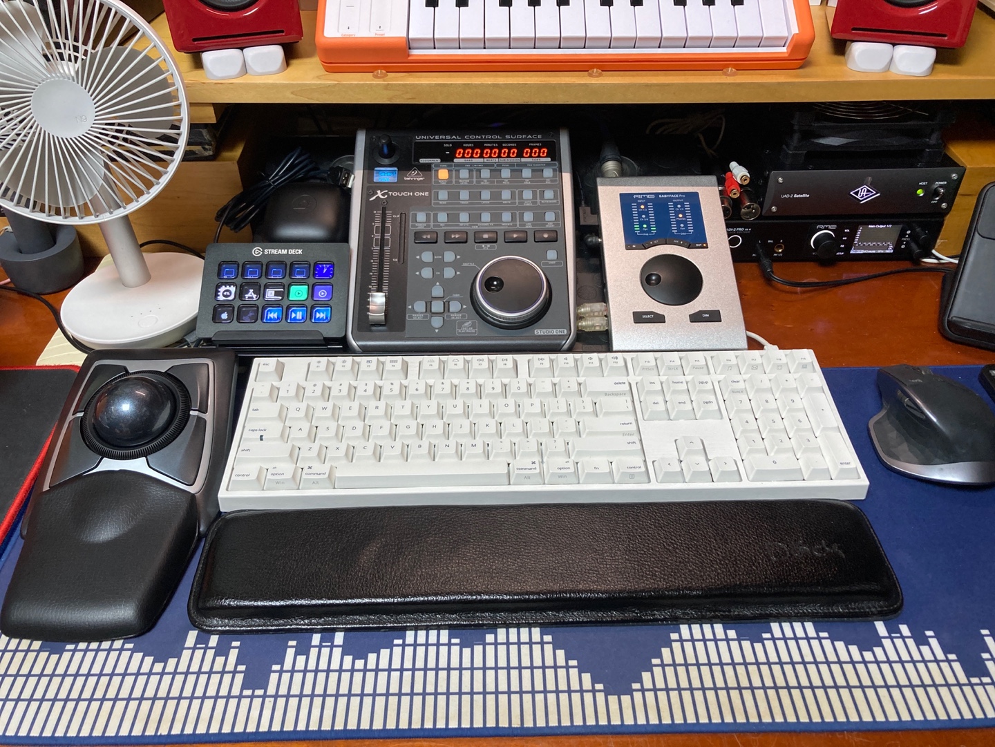 최종적으로 완성된 필자의 데스크 세팅이다. 이전에는 트랙볼 하나만 사용했지만, 이번엔 좌 트랙볼 / 우 마우스 조합으로 당분간 사용해보려 한다. 자주 쓰는 우측 손목의 부담을 최대한 줄이기 위해 왼손으로 조작을 하는, 이른바 양손잡이 조작법이다. 덤으로 되게 우주선의 조작부 같은 모습이 되었다. 필자가 자주 쓰는 장비들이 가뜩이나 버튼들이 많은데, 비슷한 사이즈의 트랙볼 마우스가 바로 옆에 붙어 있으니 더더욱 그런 느낌이 든다.