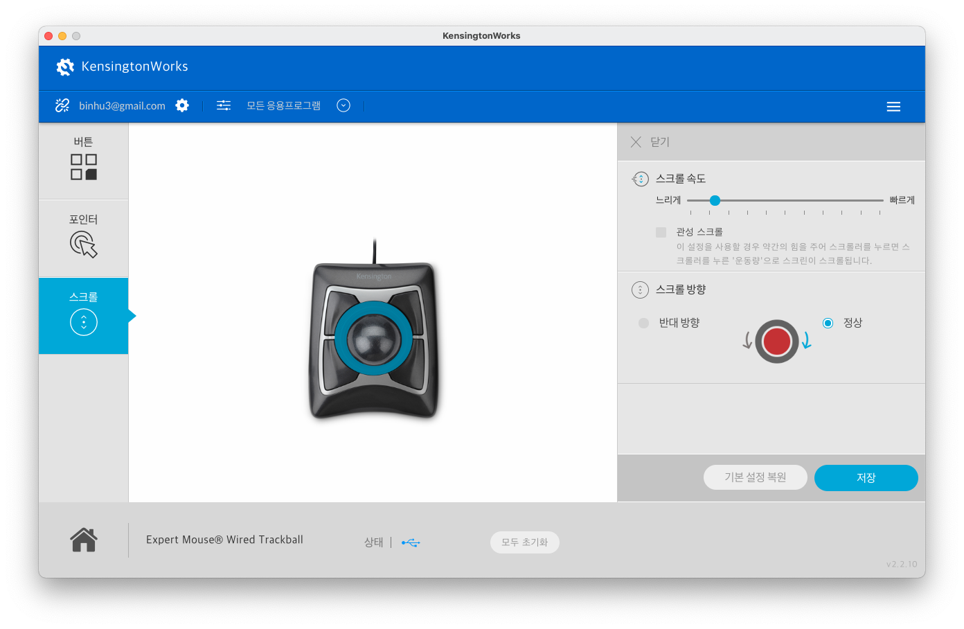 마지막으로는 스크롤 설정이다. 살살 돌려도 빠르게 스크롤이 이루어지게 만들 수도 있고, 매우 천천히 스크롤이 되게끔 할 수도 있다. 다만 필자가 Elecom HUGE에서 좋아하던 가로 스크롤 모드는 존재하지 않는 듯하다. 위의 단축키 모드에서 설정하는 게 최선인 듯하다. 스크롤 방향은 정방향과 역방향 중 하나를 선택할 수 있다. macOS의 스크롤 방향과는 호환되지 않으므로 온전히 트랙볼만의 스크롤 옵션을 커스터마이징 할 수 있다.