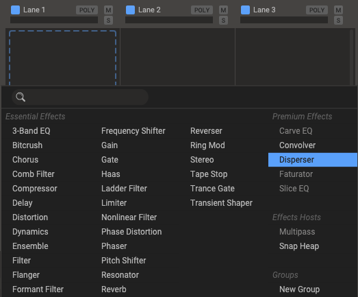 Effect 파트에서는 우리가 이미 친숙하게 봐 왔던 Convolver나 Disperser 등 Kilohearts의 플러그인들이 보인다. Phase Plant의 이펙팅은 Snapin 시스템을 적극적으로 사용하고 있기에 별도의 DAW 인서트에 플러그인을 걸지 않고도 Kilohearts의 플러그인을 불러올 수 있다. 만일 내가 Snap Heap에 만들어 놓은 채널 스트립이 있다면 Snap Heap을 그대로 Effect 창에 넣은 후 프리셋을 불러오는 것만으로도 내가 만들어 놓은 채널 스트립을 그대로 신디사이저에 적용할 수 있다.