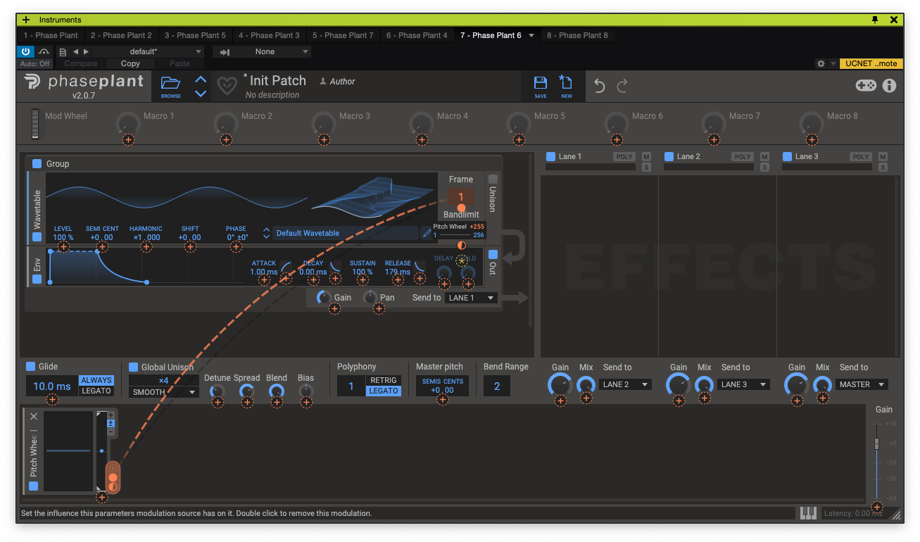 드디어 Phase Plant를 이용해 무엇을 할 수 있는지 소개할 시간이 왔다. 백문견불여일이라고, 직접 사운드를 들어보는게 확실하다. 비록 작곡에는 재능이 없는 필자지만, 퓨처 베이스의 형태를 띈 간단한 16마디의 루프와 게임 BGM 스러운 16마디 루프를 2개 정도 만들었다. 본 루프에 사용된 모든 사운드는 Phase Plant만 사용했으며, 직접 만든 사운드와 기본적으로 제공되는 프리셋만 사용해서 만들었다. 라우드니스를 확보하기 위해 마스터 단에 브릭월 리미터를 사용하였고, 일부 악기들에 스테레오 인핸스 플러그인을 사용한 것을 제외하면 모든 사운드는 Phase Plant 자체의 소리다.