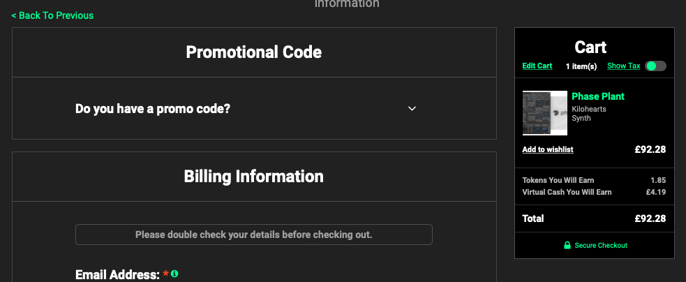 홈페이지 상단 우측에 자리 잡은 Cart를 누르면 다음과 같은 화면이 나타난다. 이 화면에서는 이번 구매로 적립되는 캐시, 구매로 적립되는 토큰을 확인할 수 있으며 상품 구매로 받을 수 있는 무료 선물을 선택할 수 있다. 만일 Plugin Boutique에서 처음 구매한다면 Claim Gift를 클릭해서 무료 선물을 받아가는 게 좋다. 플러그인 하나만 샀을 뿐인데 공짜로 다른 플러그인들도 가져갈 수 있다. 모든 작업이 완료되었다면 초록색 "Secure Checkout"을 눌러 다음 화면으로 넘어가자.