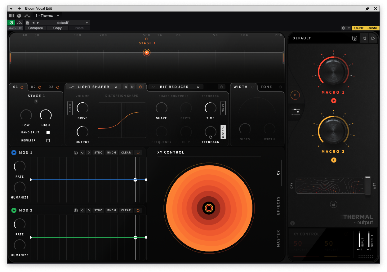 Output Thermal을 처음 실행하면 미디어아트에서 볼 법한 독특한 디자인이 먼저 반겨준다. 특징적인 주황색의 원은 매크로를 매핑해놓는 X/Y 패드다. 우측의 노브로 수동 조절을 할 수도 있지만 X/Y 패드로 조작하는 게 조금 더 편리하다. 우측 하단에는 Dry/Wet을 조절할 수 있는 페이더 및 Input 및 Output 양을 조절할 수 있는 페이더가 있다. 디자인은 거대한데 기능은 굉장히 간편하다!