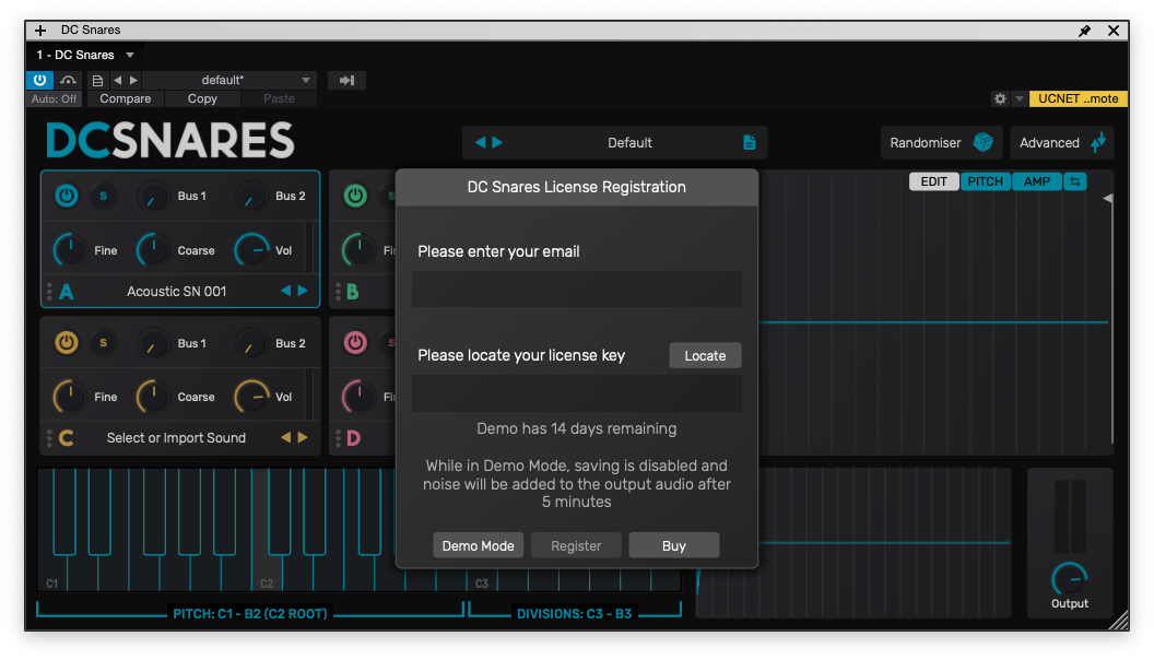 PluginBoutique DC Snares를 설치 후 처음 실행하게 되면 이메일과 함께 라이센스 키를 넣으라는 메시지가 나타난다. 여기에 라이센스 키를 넣게 되면 플러그인 인증이 완료되는 형태다. 라이센스 키를 넣지 않아도 30일 체험판을 선택하거나 데모 모드로 사용할 수 있지만 5분 뒤에 화이트 노이즈가 같이 재생된다. 체험 목적이라면 30일 체험판을 선택하자. 이메일은 자주 사용하는 메일을 넣으면 된다. 필자는 PluginBoutique에 등록한 이메일을 입력했다.