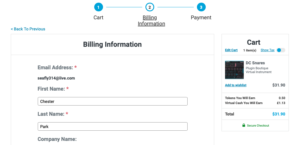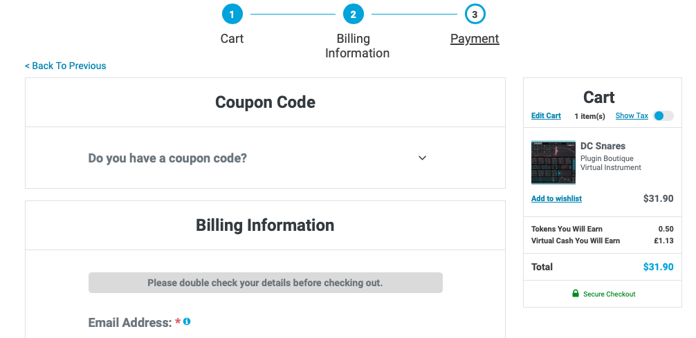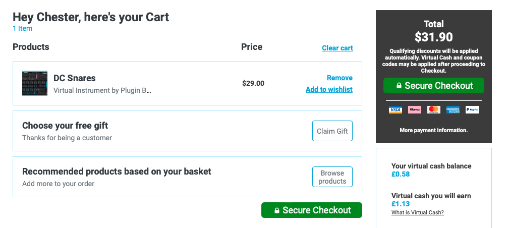 홈페이지 상단 우측에 자리 잡은 Cart를 누르면 다음과 같은 화면이 나타난다. 이 화면에서는 이번 구매로 적립되는 캐시, 구매로 적립되는 토큰을 확인할 수 있으며 상품 구매로 받을 수 있는 무료 선물을 선택할 수 있다. 만일 Plugin Boutique에서 처음 구매한다면 Claim Gift를 클릭해서 무료 선물을 받아가는 게 좋다. 플러그인 하나만 샀을 뿐인데 공짜로 다른 플러그인들도 가져갈 수 있다. 무료로 받을 수 있는 플러그인들은 기간에 따라 다르니 미리 구매 전에 어떤 걸 무료로 주는지 체크해 보는 것도 좋다. 모든 작업이 완료되었다면 초록색 "Secure Checkout"을 눌러 다음 화면으로 넘어가자.
