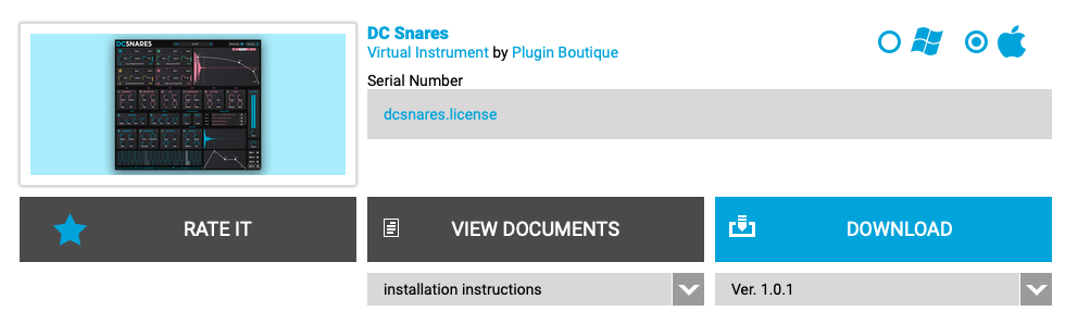 결제가 끝난 후, 상단의 "My Account"를 클릭하면 사진과 비슷한 형태로 방금 전에 구매한 PluginBoutique DC Snares의 시리얼 번호가 표시되어... 있지 않다. PluginBoutique DC Snares는 별도의 .license 파일로 라이센스 인증을 제공한다. 그렇기에 이 파일을 미리 받아놓을 필요가 있다. 그 밖에도 설치 파일 다운로드와 설치 시 주의사항 등을 확인할 수 있다. 만일 시리얼 대신 영문으로 긴 안내문이 표시되어 있다면 아직 전산상으로 시리얼 번호가 발급되지 않았다는 뜻이므로 조금 기다려야 한다.