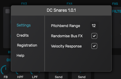 그 밖의 기능들은 좌측 상단의 DC Snares 글자를 클릭하면 나타나는 설정 창에서 조절할 수 있다. 피치 밴드의 범위나 FX 버스의 Randomise 적용 여부, 벨로시티 적용 여부 등을 설정할 수 있다. DC Snares를 사용하면서 제품 인증 관련 정보라던가 궁금한 점도 여기서 확인할 수 있다.