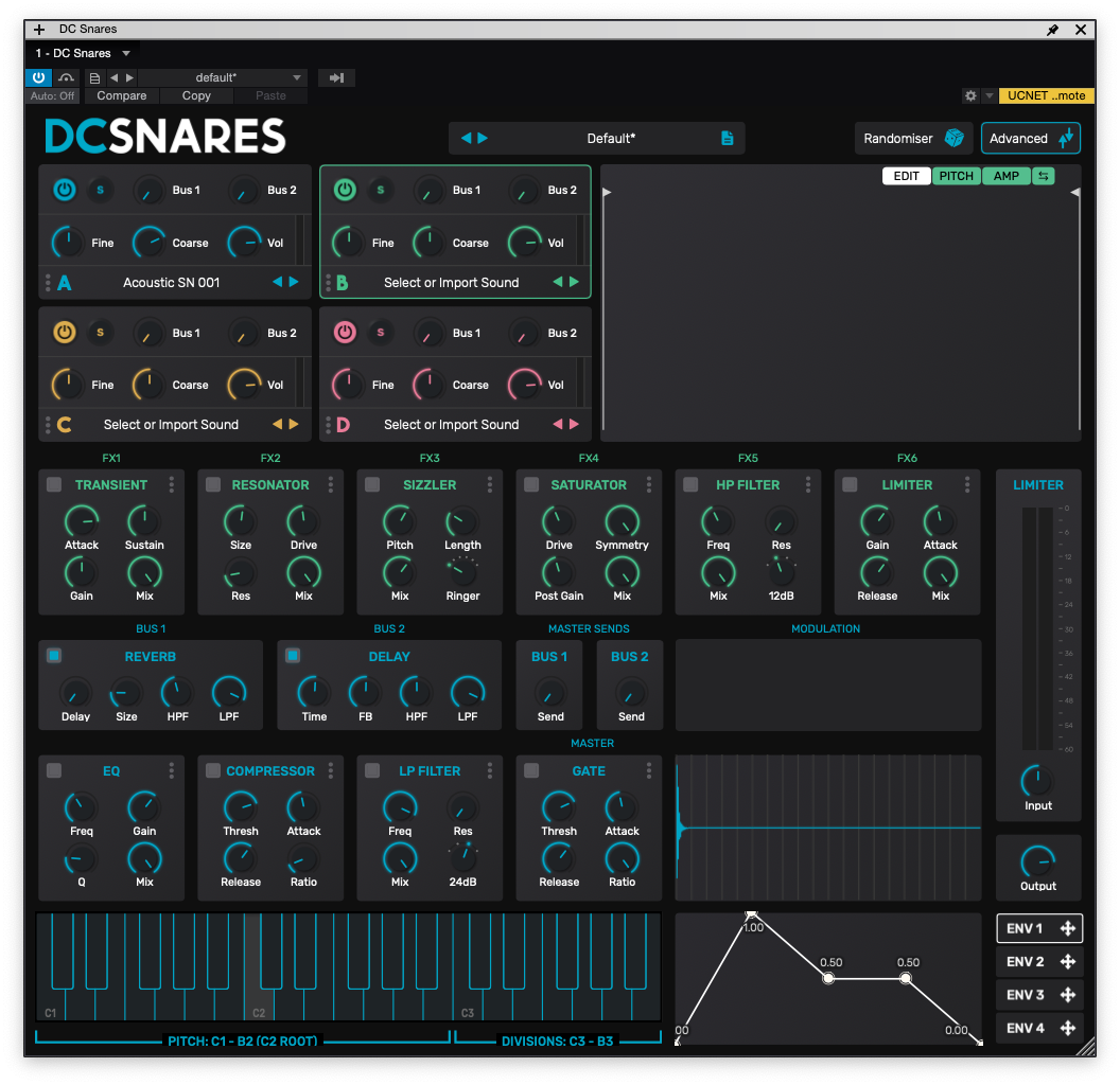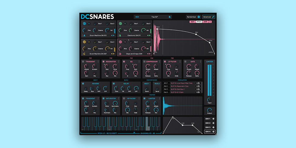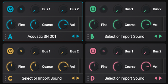 그럼 스네어를 위한 가상 악기, DC Snares에는 어떤 기능들이 들어가 있는지 구간별로 차근차근 살펴보자. 좌측 상단에는 4개의 스네어 톤 조작 모듈이 있다. 즉 스네어 레이어링을 위한 오실레이터 같은 느낌이라 보면 된다. 기본적으로 내장되어 있는 샘플을 사용할 수도 있고, 외부 샘플을 집어넣어 사용할 수도 있어 선택폭이 넓다. 튠 조절, 음색 조절, 소리 크기 조절이 가능하다. 또한 별도의 버스 채널이 내부에 내장되어 있어 딜레이, 리버브를 쉽게 먹일 수도 있다. 조작하는 섹션에 따라 색이 바뀌므로 잘못된 부분을 잡고 조작할 여지를 줄였다.